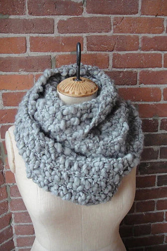 The Seed Stitch Cowl is a gorgeous voluminous cowl— a true statement piece! This is a very simple pattern knit in seed stitch. One skein of Knit Collage Sister will make a cowl that loops twice around the neck. Two skeins will give you the full length version pictured. The colorway shown is Soft Grey Heather.
