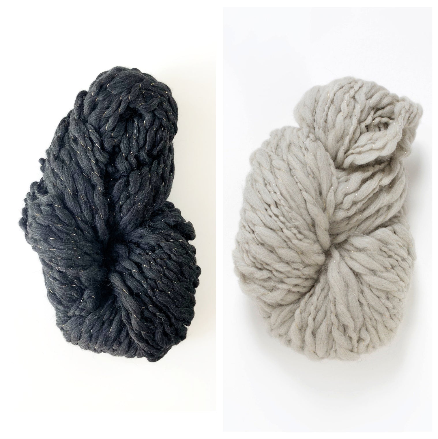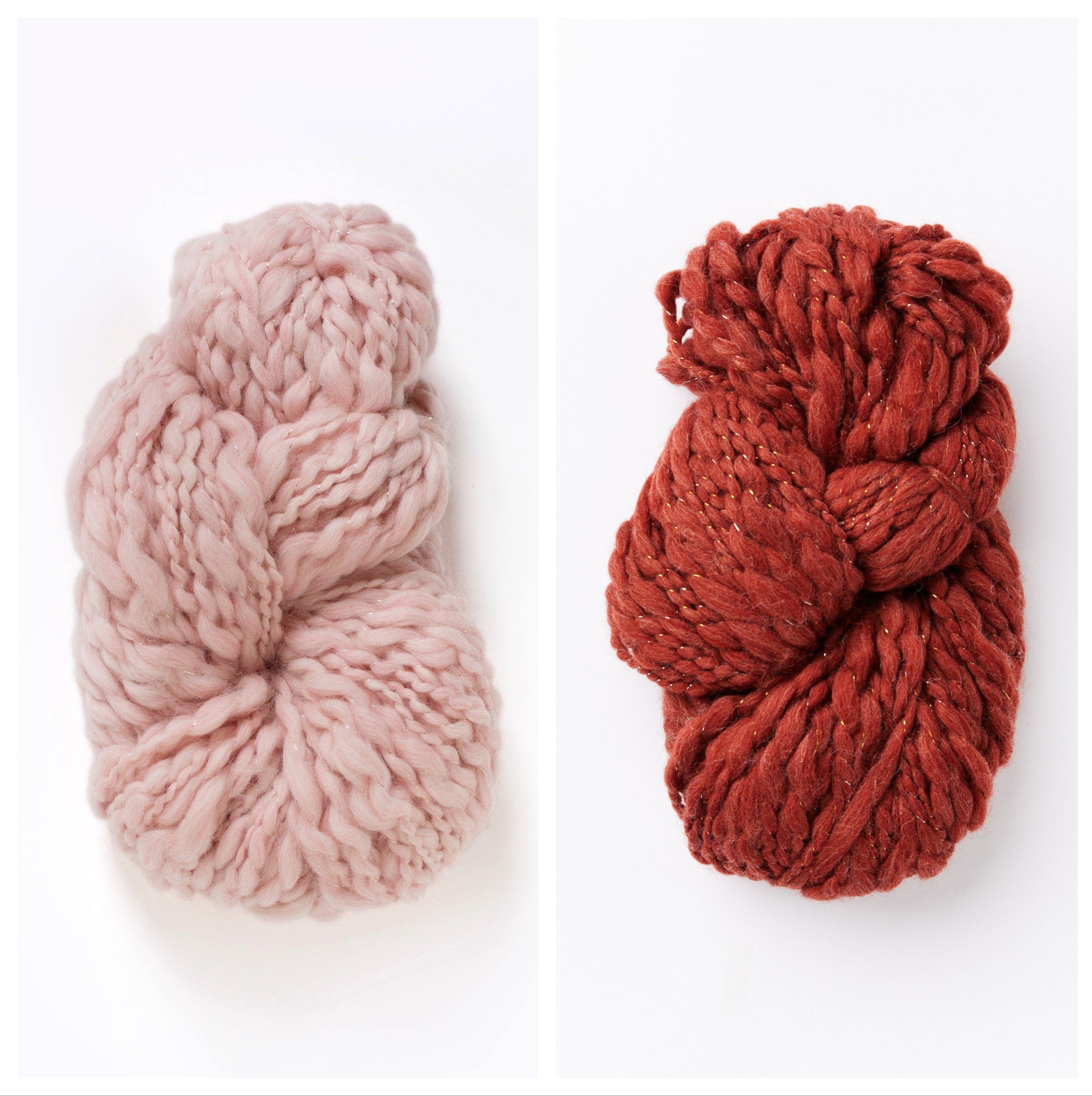 * The yarn needed to complete this project, including 3 skeins of Spun Cloud or Sister yarn (2 skeins of a main color and 1 skein of a contrasting color). The sample is knit up in the color way, Soft Ivory Sister (MC) / Honeysuckle Spun Cloud (CC)
