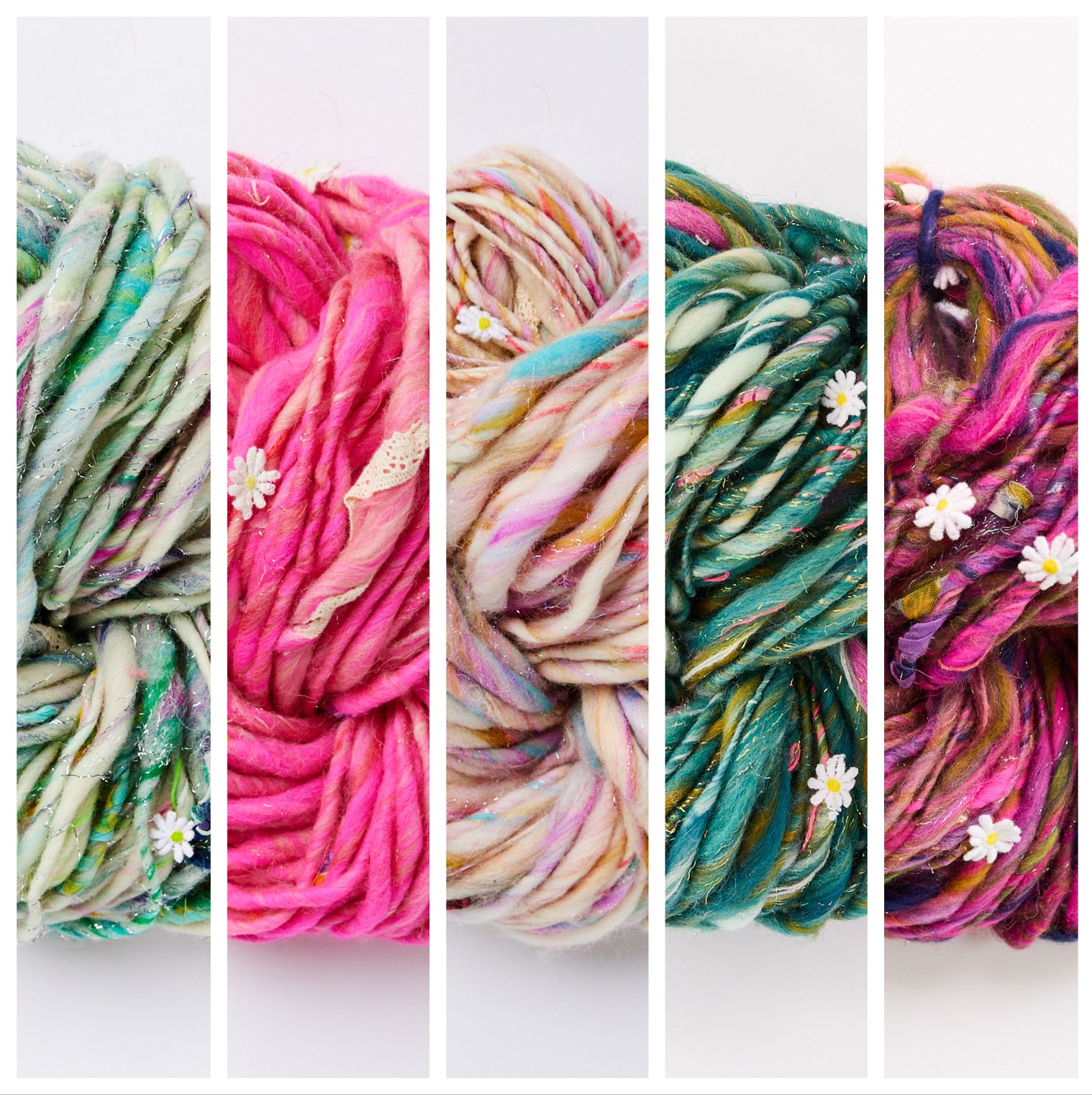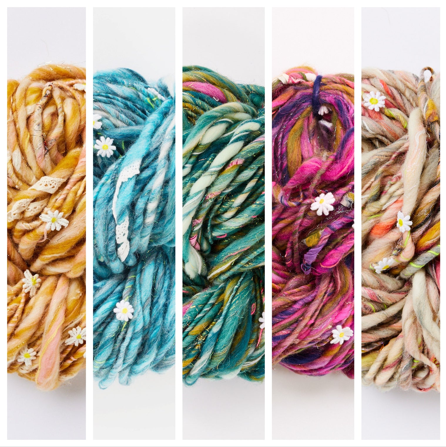 * The yarn needed to complete this project, including 6-11 skeins of Daisy Chain (required yarn amount varies upon size you purchase). Please note any modifications to size or length may require additional yarn. This is for the mixed yarn version of Walking on Sunshine. You can check out the solid Walking on Sunshine Sweater listing here.