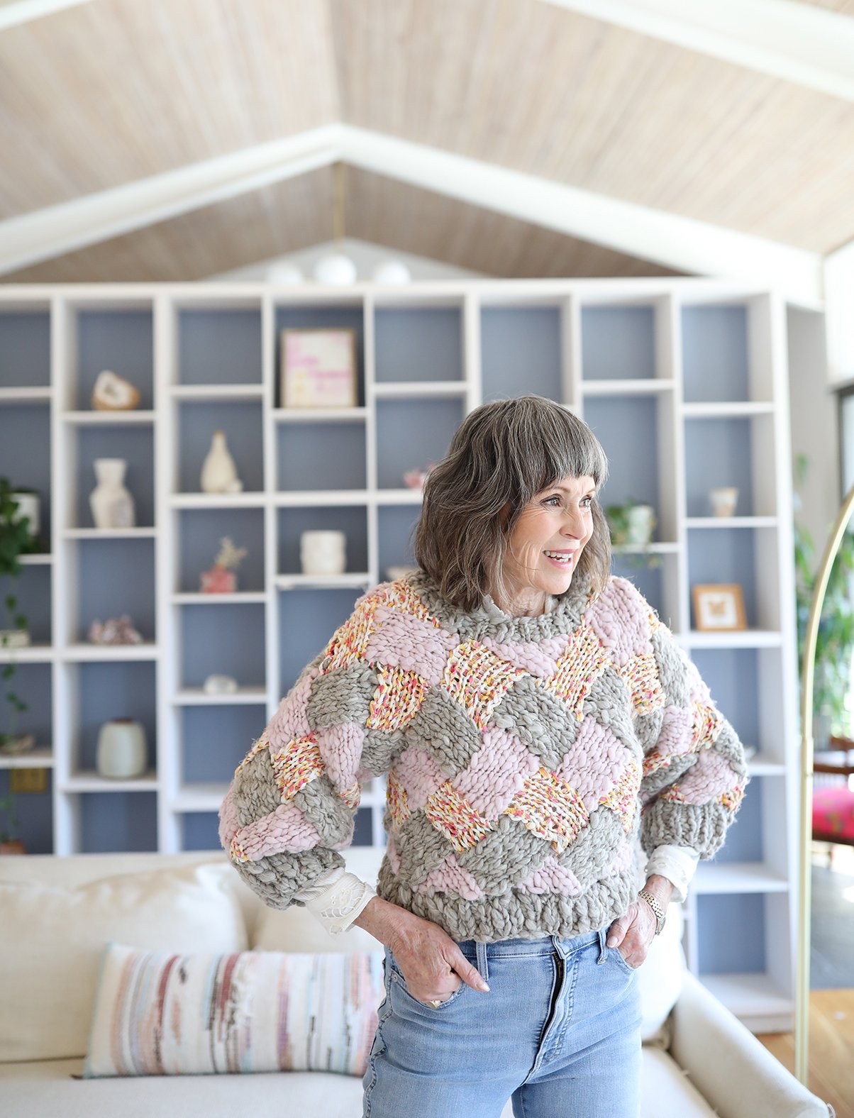 The Harley 2.0 Sweater is an entrelac sweater knit with 3 of our unique, handspun yarns. It is worked bottom up, both in the round and flat. The entrelac stitch looks trickier than it actually is! In this version, we knit just 3 yarns together as opposed to the 5 used in the original.
