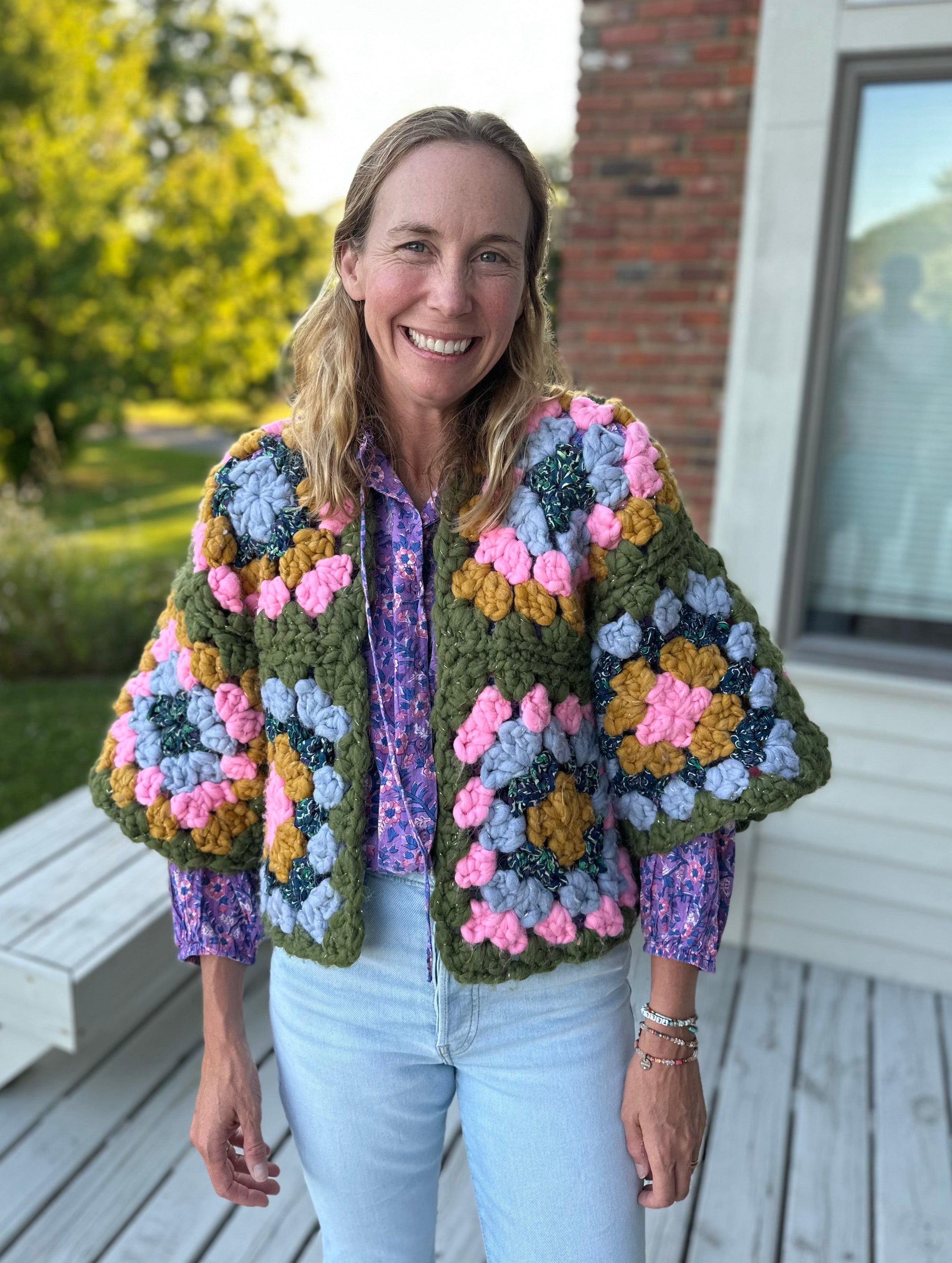 Model posing in front of flower wall wearing lavender and orchid crochet granny square cardi over a V-neck t-shirt with denim jeans and heeled boots