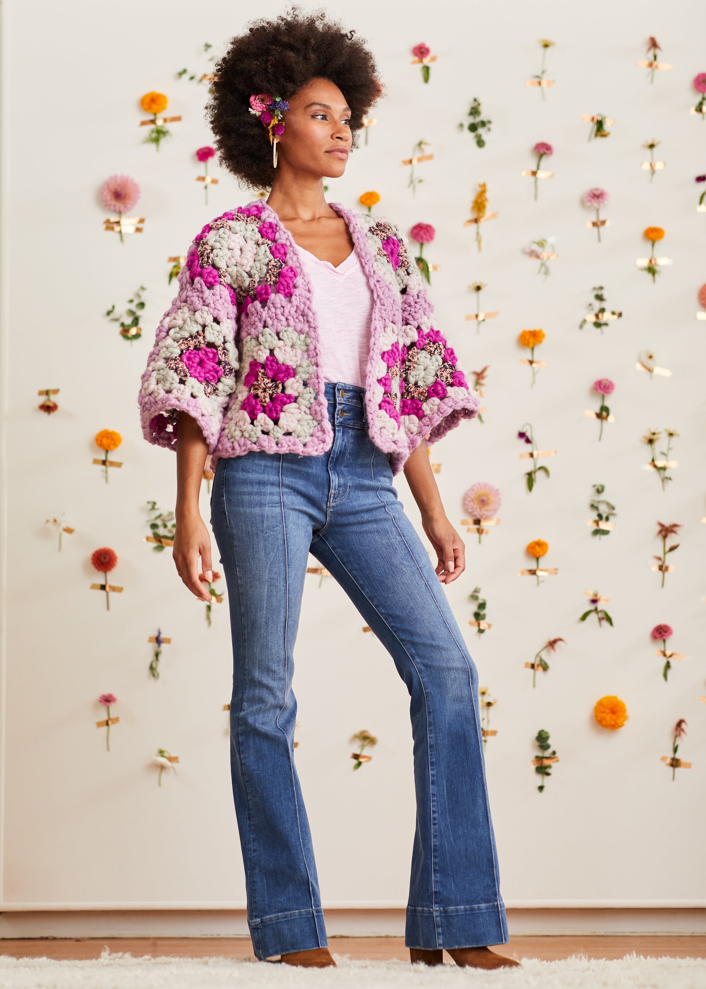 The Maisie Crochet Cardi is a colorful, timeless garment with a retro feel. Designed with an oversized fit, this cardigan is formed entirely by large granny squares using a variety of yarn. Granny squares are perfect for beginner crocheters and the possibilities for them are endless. They are also quite addicting, making this a quick pattern and something you will enjoy creating in different color combos to go with everything in your wardrobe!
