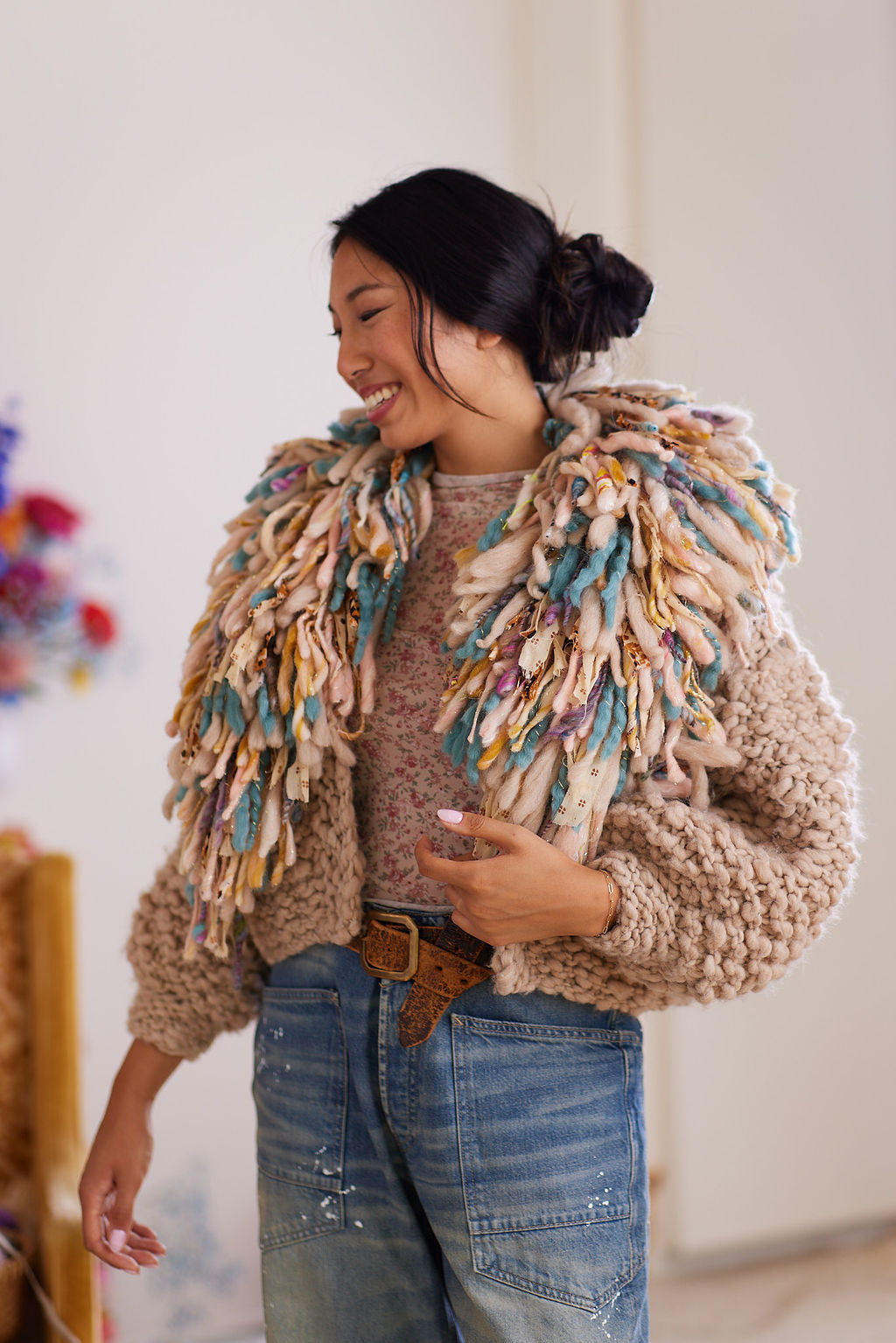 Introducing the Rhinebeck Sweater with Detachable Collar, a cropped boxy V-neck cardigan with a unique twist - a detachable fringed collar. This stylish and versatile garment combines classic design elements with a modern touch, making it a must-have addition to any fashion-forward wardrobe. This cardigan is crafted using garter stitch, which is known for its rows of knit stitches and creates a beautifully textured fabric, giving this cardigan a cozy, yet sophisticated look.