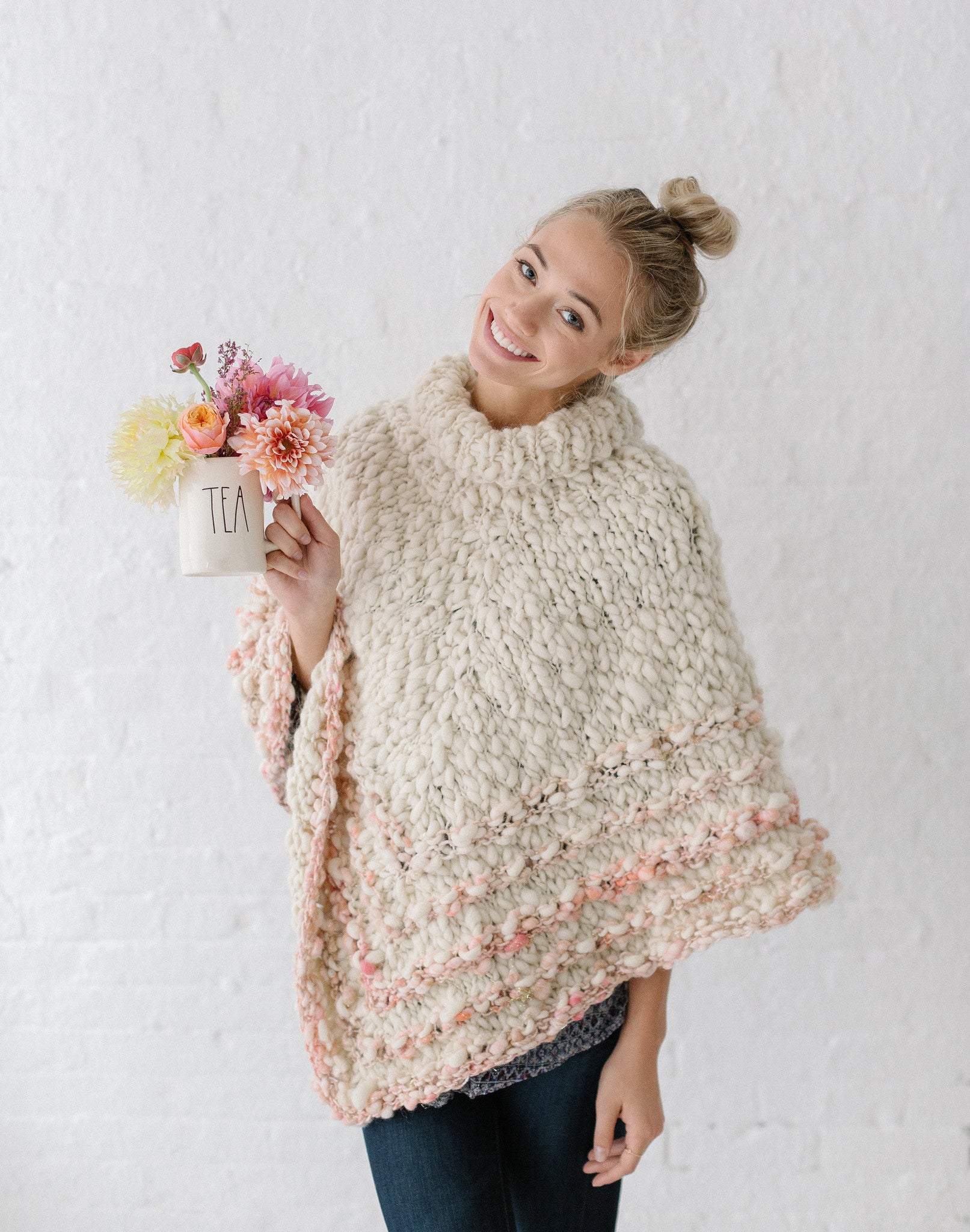 Our Rustic Handpsun poncho is perfect for autumn saturdays spent apple picking at your local farm or perusing through vintage treasures at a flea market. The body of your poncho is knit in Sister yarn and the stripes in contrasting Cast Away yarn. The effect is a stunning mix of stitches, texture and color. This design features a rib neck and is knit top down, a total cinch to knit!