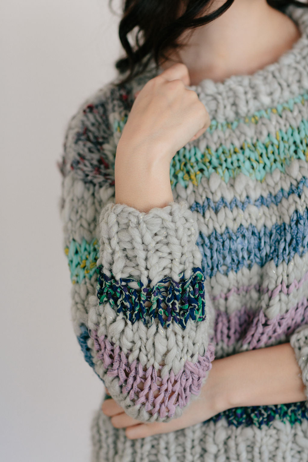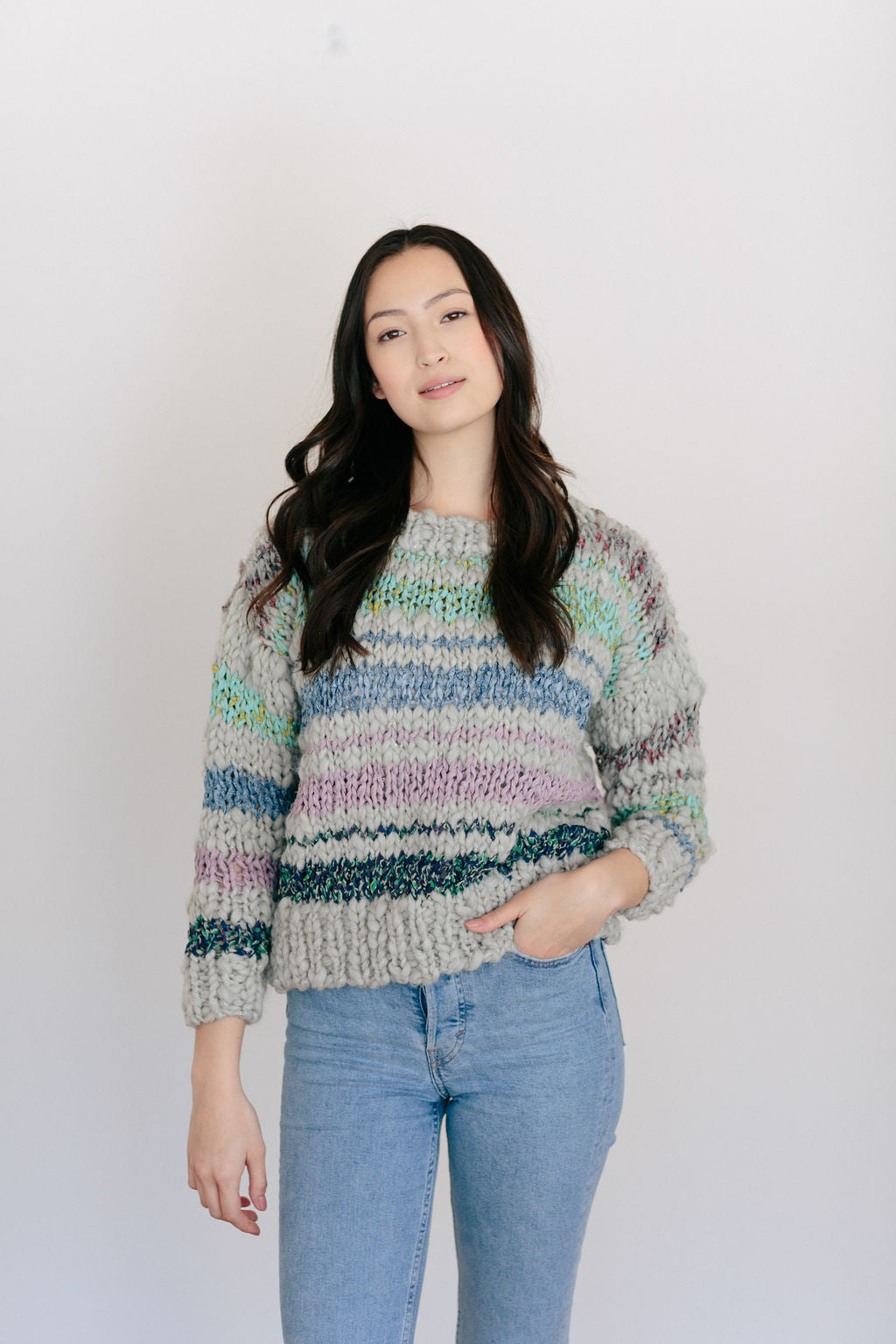 The Saturday Sweater is a simple, classic silhouette. What makes this one fun and unique is the yarns you'll choose! You'll use one main color yarn in super soft Spun Cloud and then stripe in either a Wildflower Mini skein Sampler Kit or choose one of our mixed Mini Skein Sampler Kits. The end result is a mix of color, print and pretty textures. The silhouette is simple yet classic which means lots of room for you to play with yarn mixing and color placement. This sweater, like most of our designs, whips up quickly on large needles. If you'd like help choosing a color combination, as always feel free to drop us a line!