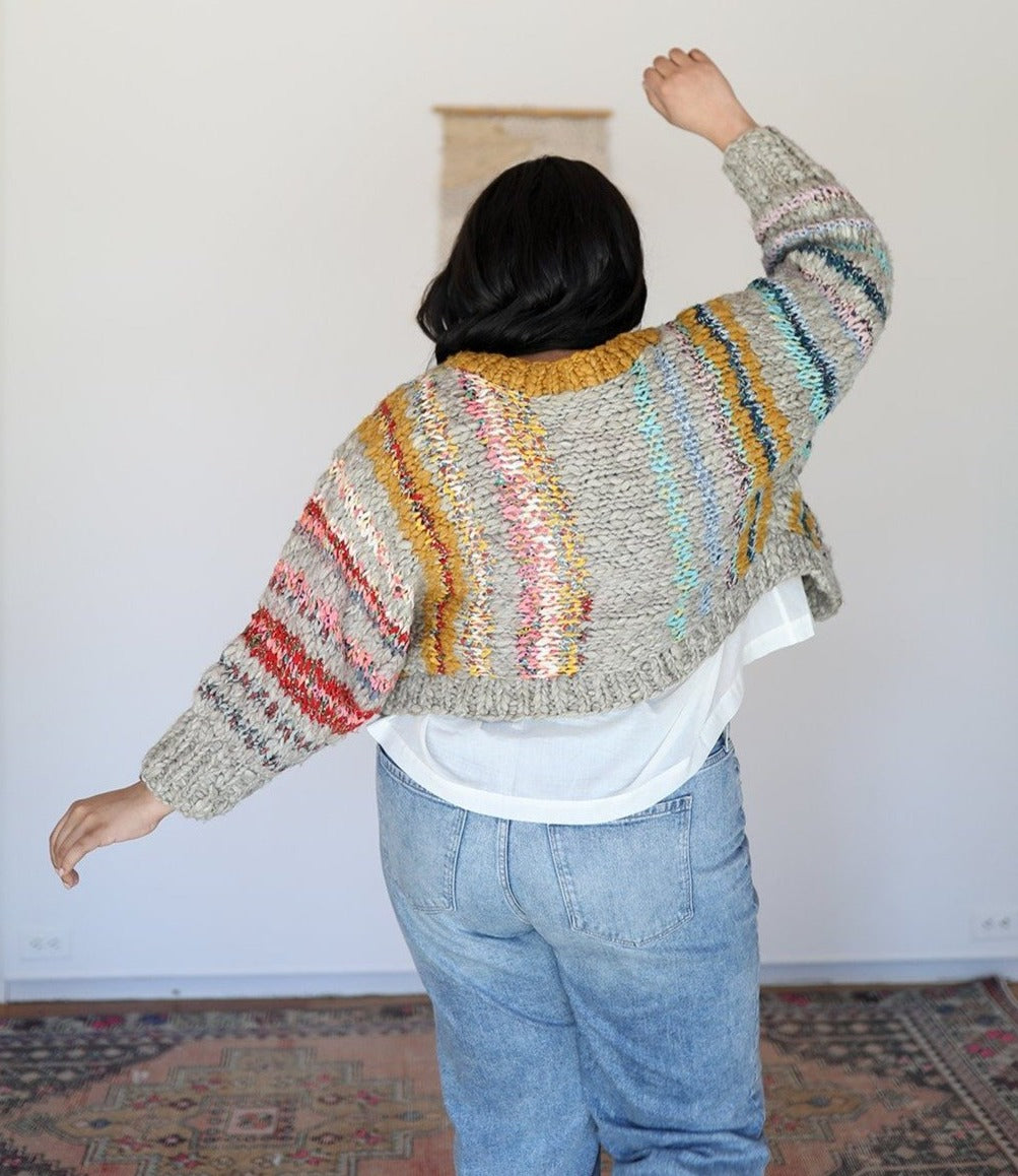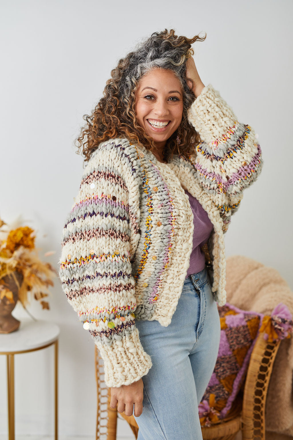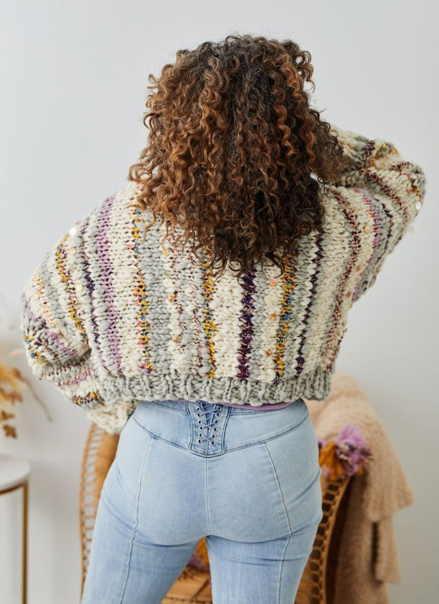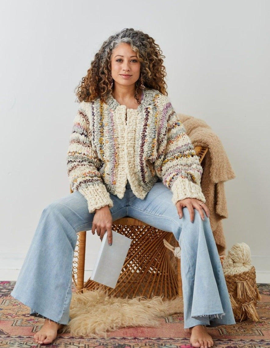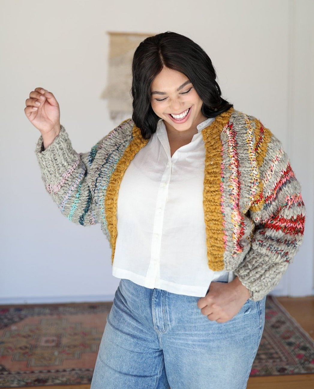The Sunbeam Stripe Cardi is a fantastic first sweater option! Let your creative spirit run wild with the Sunbeam Stripe Cardi. There is no wrong way to knit this one! It's all about mixing yarns, colors and textures in a way that resonates with you and makes you feel free as you knit. Did we mention that it's a whole lot of fun too?! The Cardi is created by working sideways from cuff to cuff. You’ll need one skein of our Spun Cloud for the cuff, neck, bottom and front ribbings. The rest is all the main color Spun Cloud, Wildflower Mini Kits and Mini Skein Sampler Kits. Have fun mixing colors and making it your own, we even mixed in some sequins and beads into the French Vanilla version shown here.
