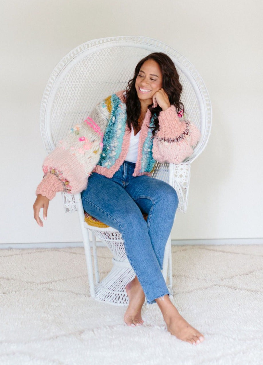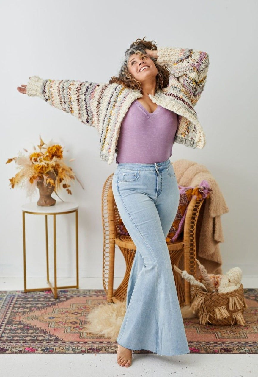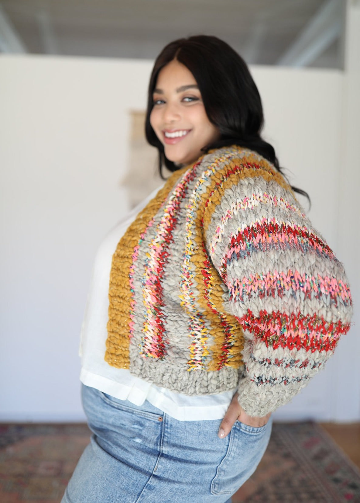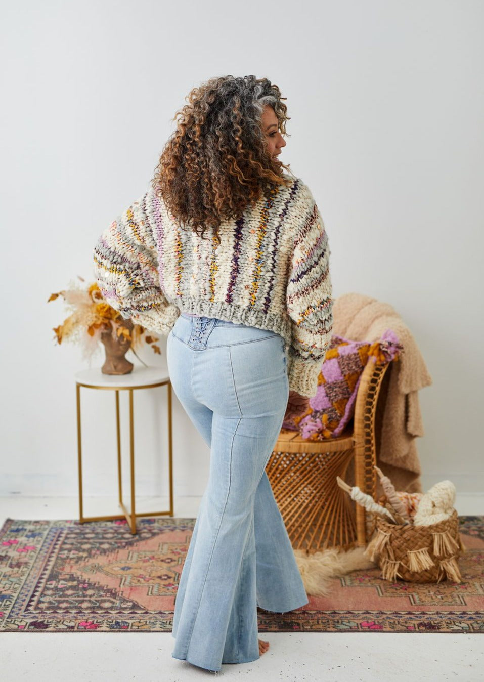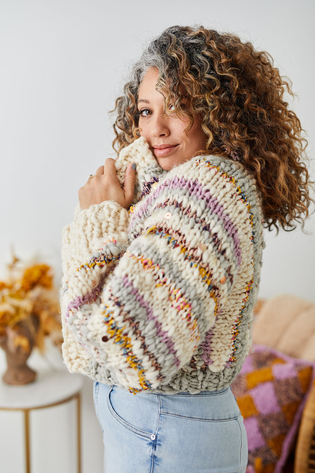 The Sunbeam Stripe Cardi is a fantastic first sweater option! Let your creative spirit run wild with the Sunbeam Stripe Cardi. There is no wrong way to knit this one! It's all about mixing yarns, colors and textures in a way that resonates with you and makes you feel free as you knit. Did we mention that it's a whole lot of fun too?! The Cardi is created by working sideways from cuff to cuff. You’ll need one skein of our Spun Cloud for the cuff, neck, bottom and front ribbings. The rest is all the main color Spun Cloud, Wildflower Mini Kits and Mini Skein Sampler Kits. Have fun mixing colors and making it your own, we even mixed in some sequins and beads into the French Vanilla version shown here.