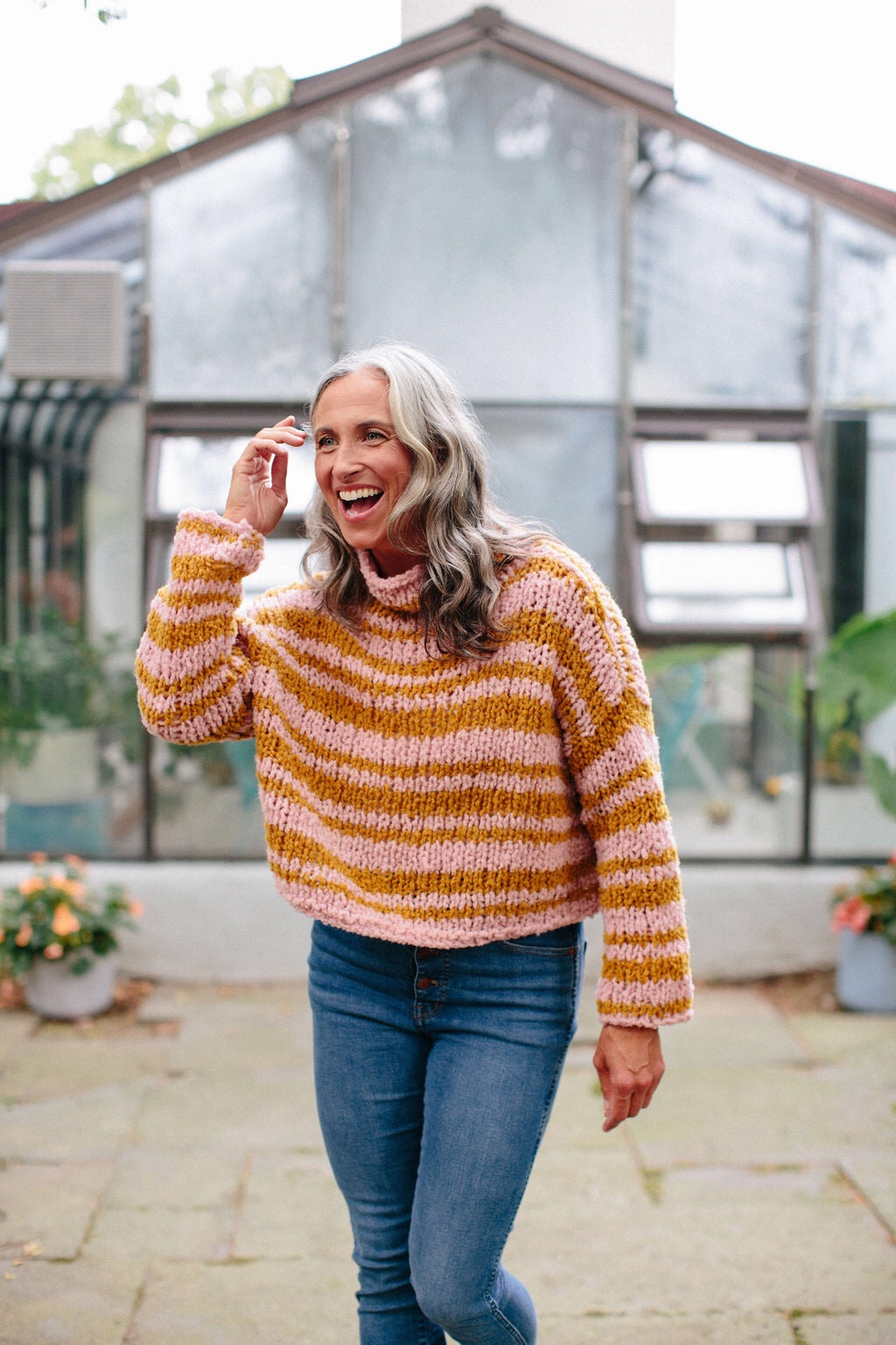 The Serenity Stripe Sweater is one of those go-to sweaters that is so comfortable and cozy you will not want to take it off! Our Serenity Boucle yarn is ultra-light weight and soft. This sweater is an oversized drop-sleeve construction, worked seamlessly from the top down. It is worked both flat and in the round, beginning with the turtleneck and then working the back and front pieces, at first, separately and then together, ending with a split hem. Sleeves are picked up around the armholes and worked in the round with slight decreases. This sweater is truly the perfect piece to add to your hand knit wardrobe.