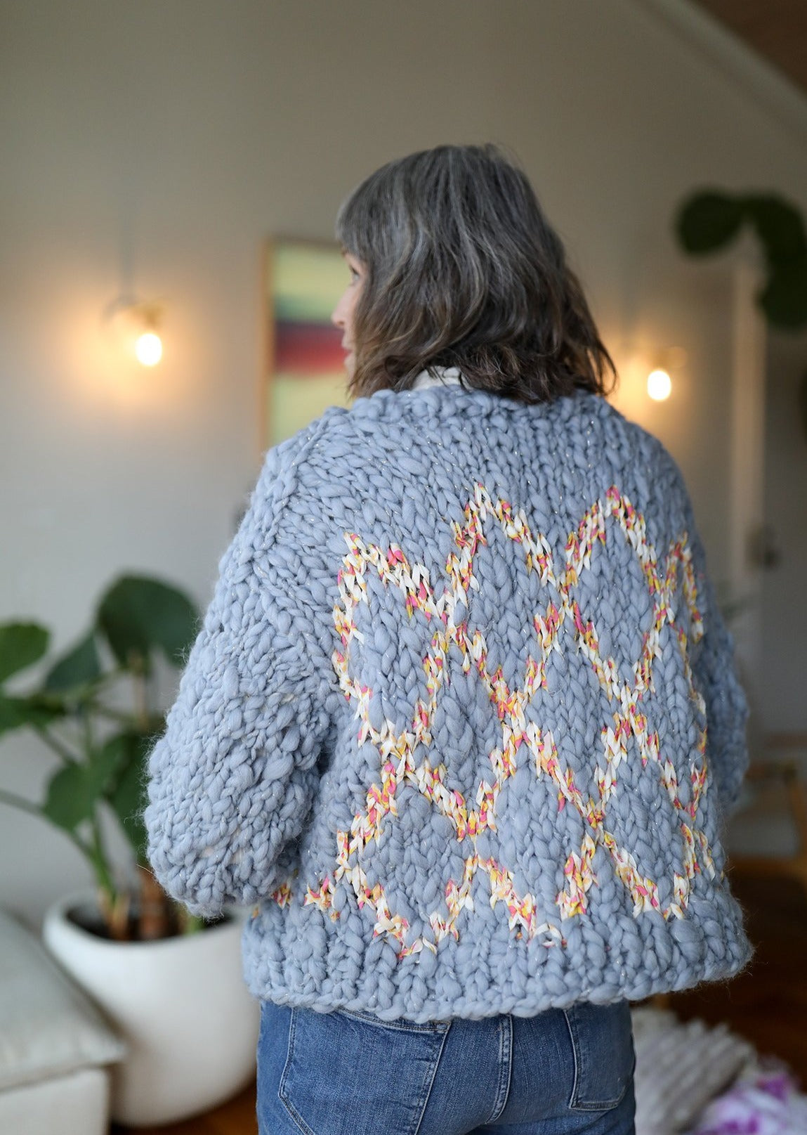 The High Fives Cardi is the perfect blend of preppy and chic for those days where you want to be stylish and comfortable. Worked from the top down seamlessly, this cardigan is a modified drop shoulder style that has a slightly oversized fit. Stranded knitting is used throughout the body to showcase an argyle colorwork pattern, while simple lace is worked on the shoulders and throughout the sleeves. The colorwork and lace are beginner friendly so that you can successfully create a fun cardigan that is a great transition piece to wear between the seasons.