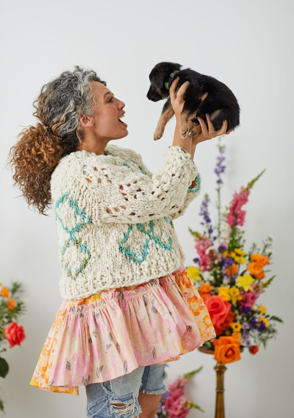 Model wearing High Fives Cardi holding a little black and tan puppy