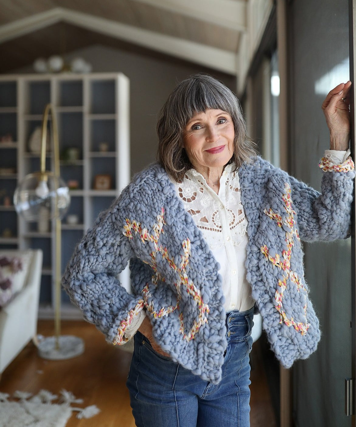 Model wearing High Fives Cardi in Breezy Blue and Ochre Rose yarns