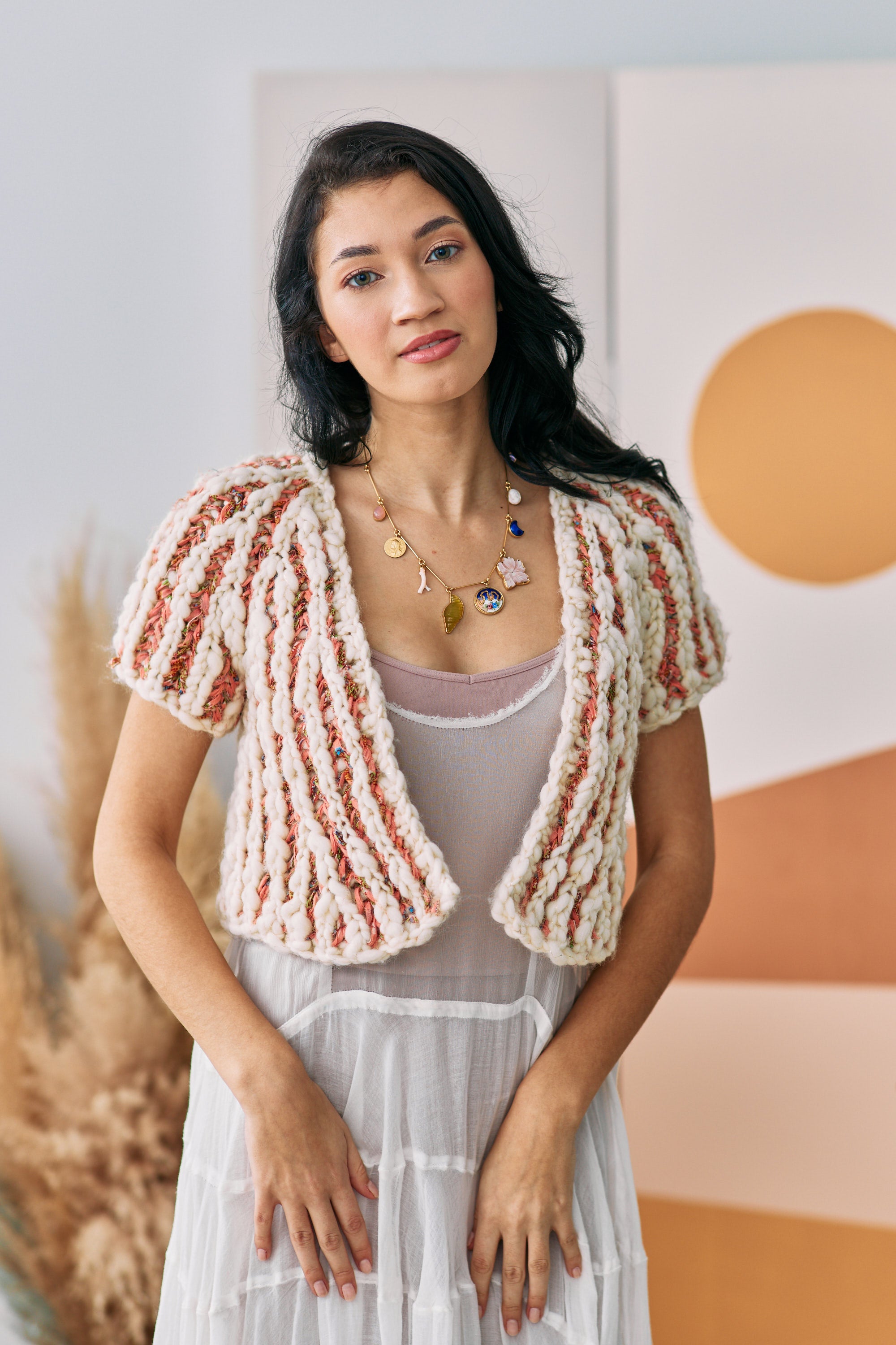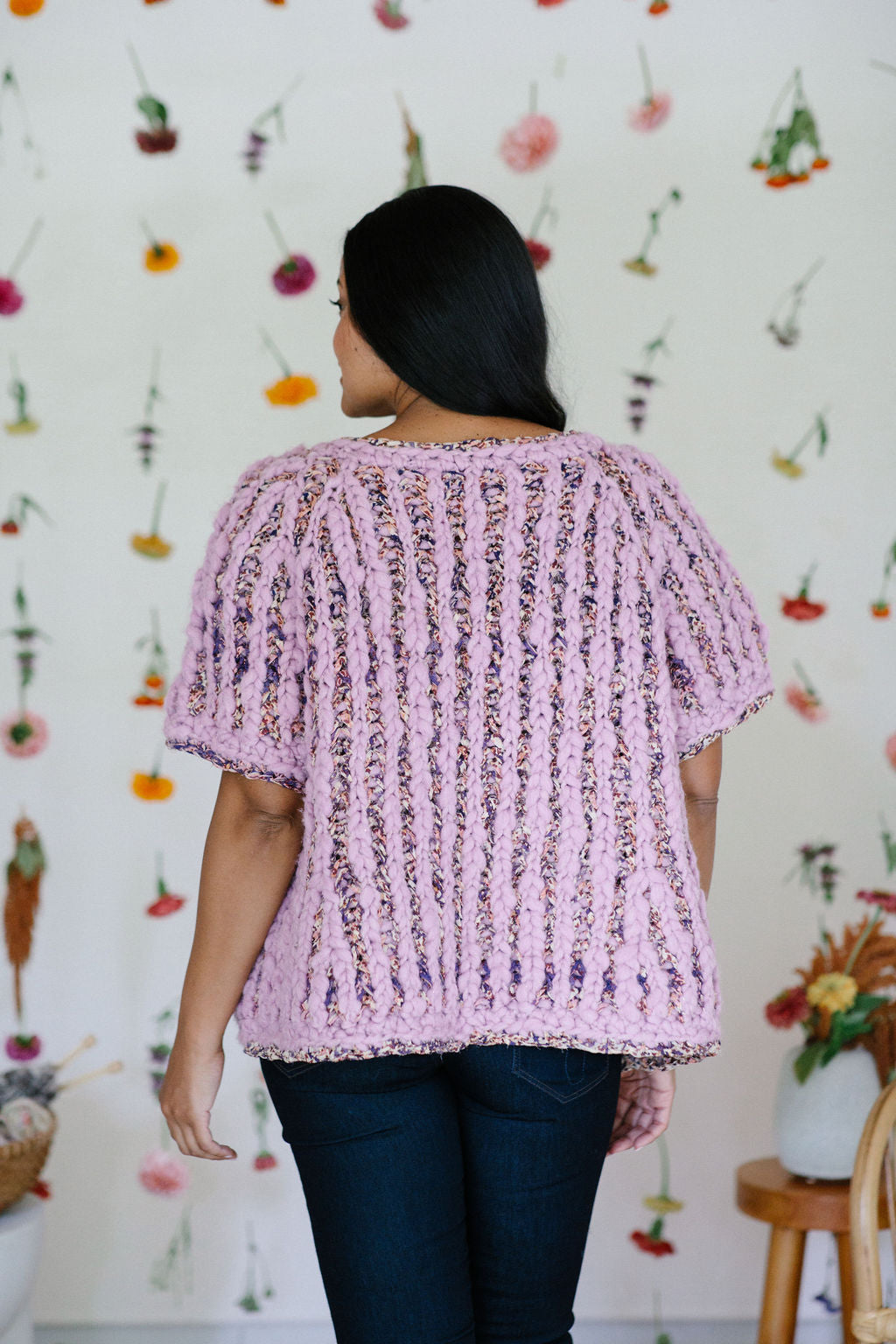 Take your knitting to the next level with this beautiful, intricate, and completely reversible brioche cardi. Newer to knitting or ever been curious about the brioche technique? This might just be the design to teach you all the elusive ins and outs of brioche! Worked from the top down seamlessly, the Grow With Me Cardi is a raglan-style, cropped cardigan that showcases the contrast between Spun Cloud and Wildflower yarns using brioche, creating a bold branching and rooting effect as increases are added. It features an open V-neck, short cap sleeves, and choice of a flared or straight body. It's such a perfect piece to throw over your shoulders that you won't want to take it off!