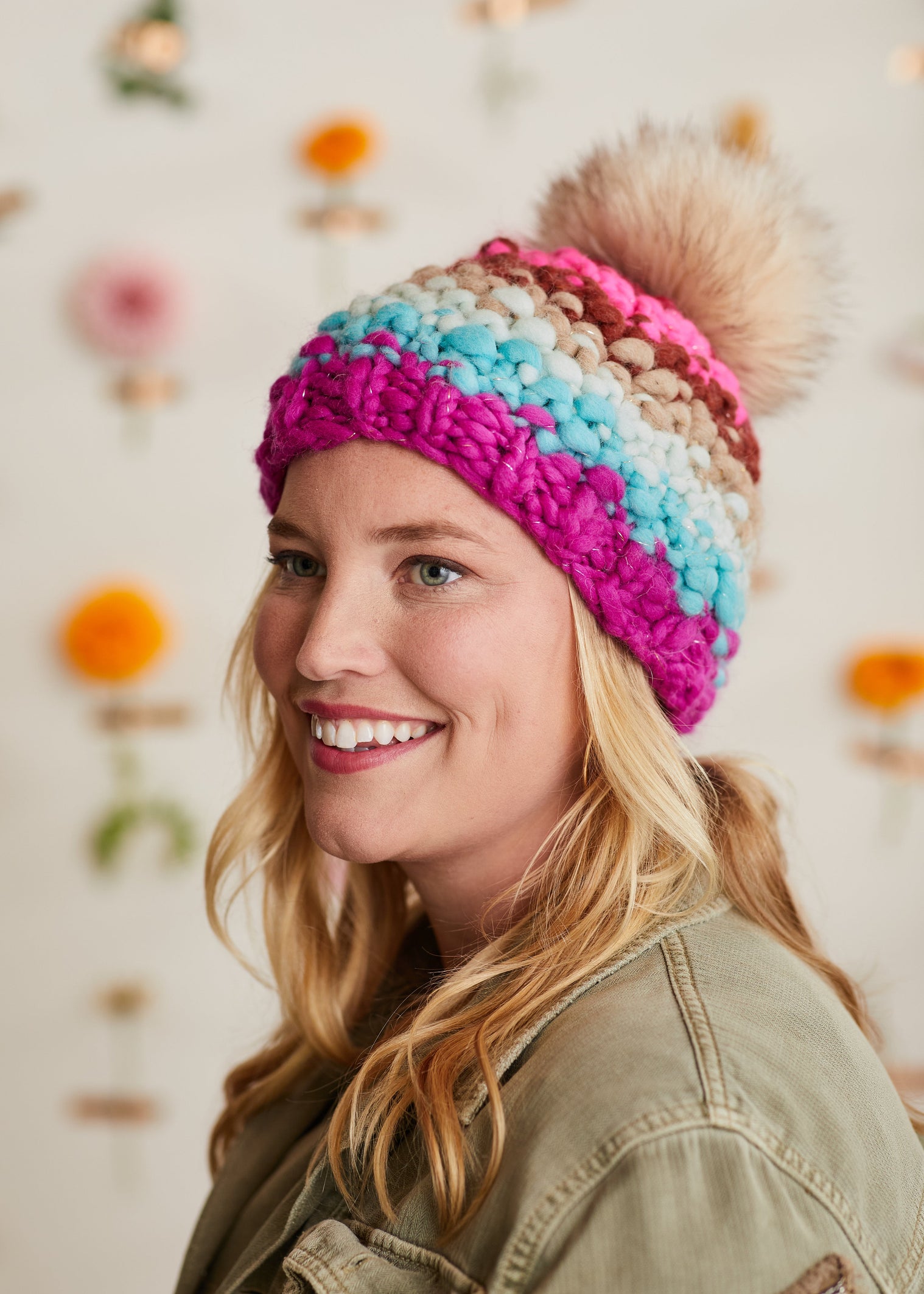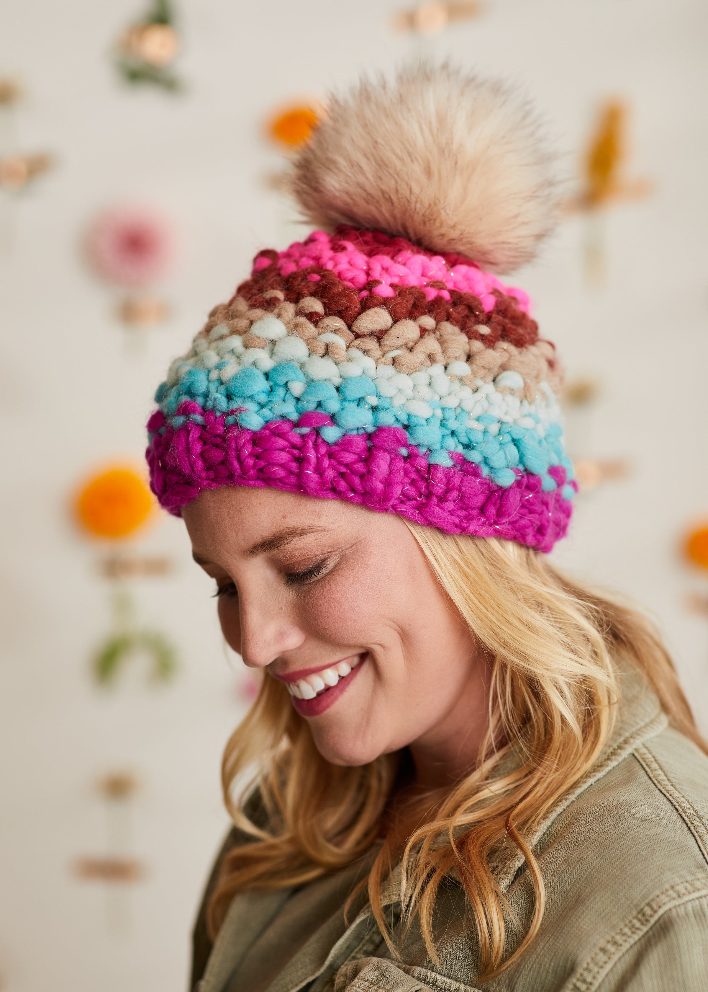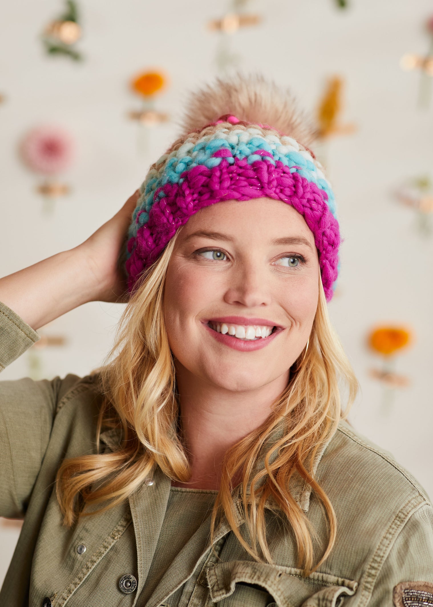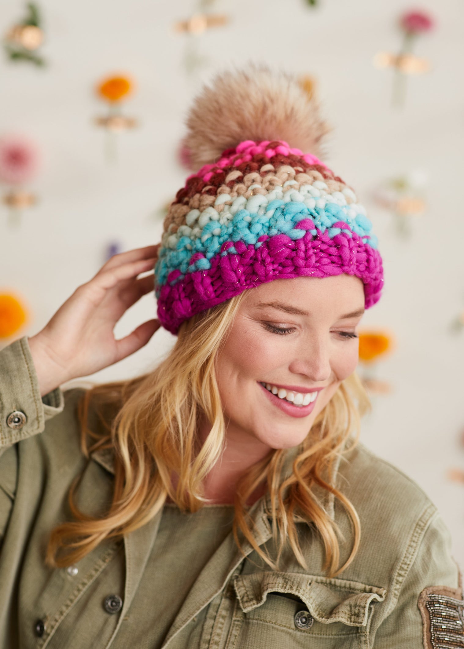 Dress yourself up from head to toe in your own multicolor mix! The Over the Rainbow Hat is a stylish way to keep your head warm and the perfect companion to go with your Over the Rainbow Cardi. It can be made using leftover yarns with as many or as few colors as you’d like. This hat works up quickly and would be a wonderful gift for someone special.
