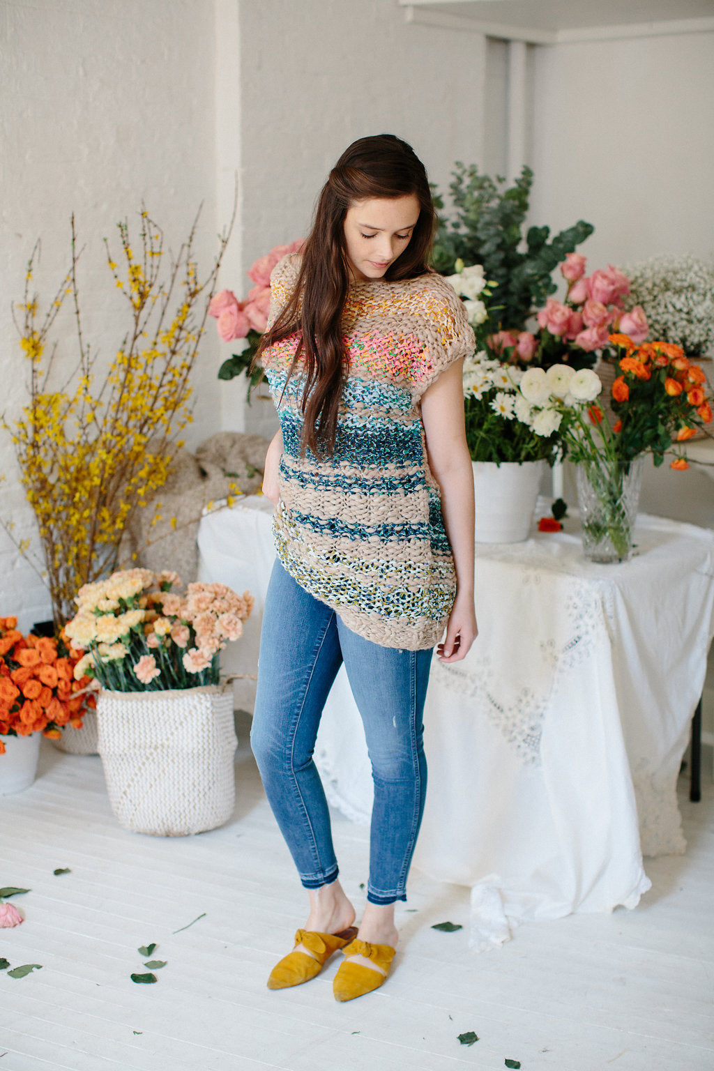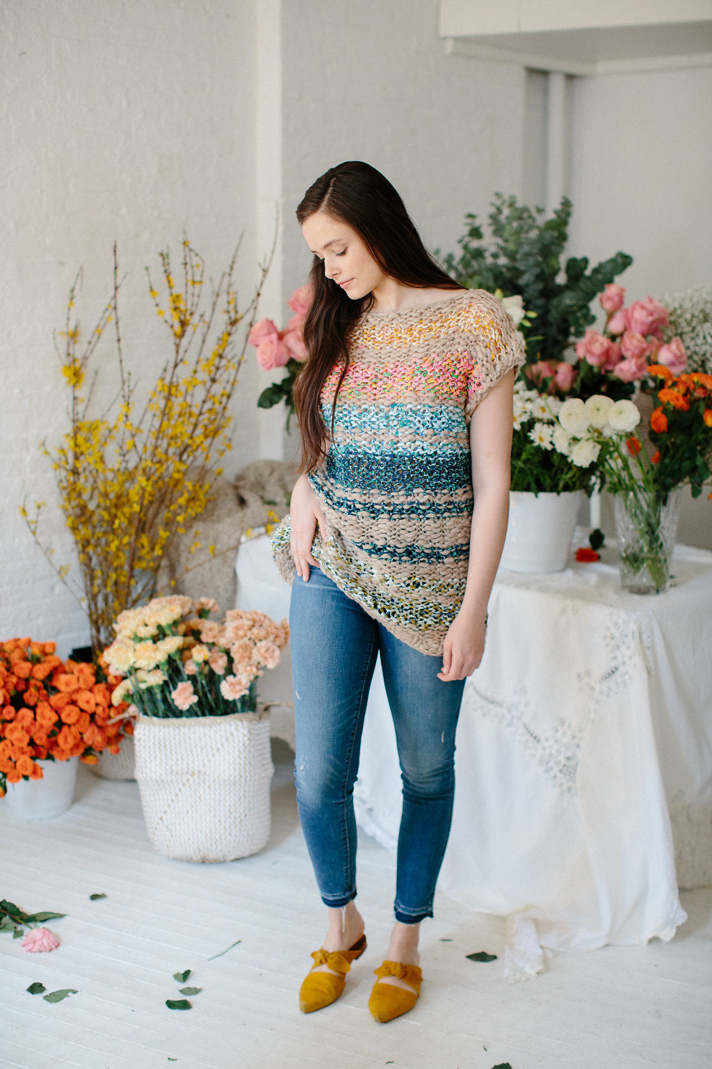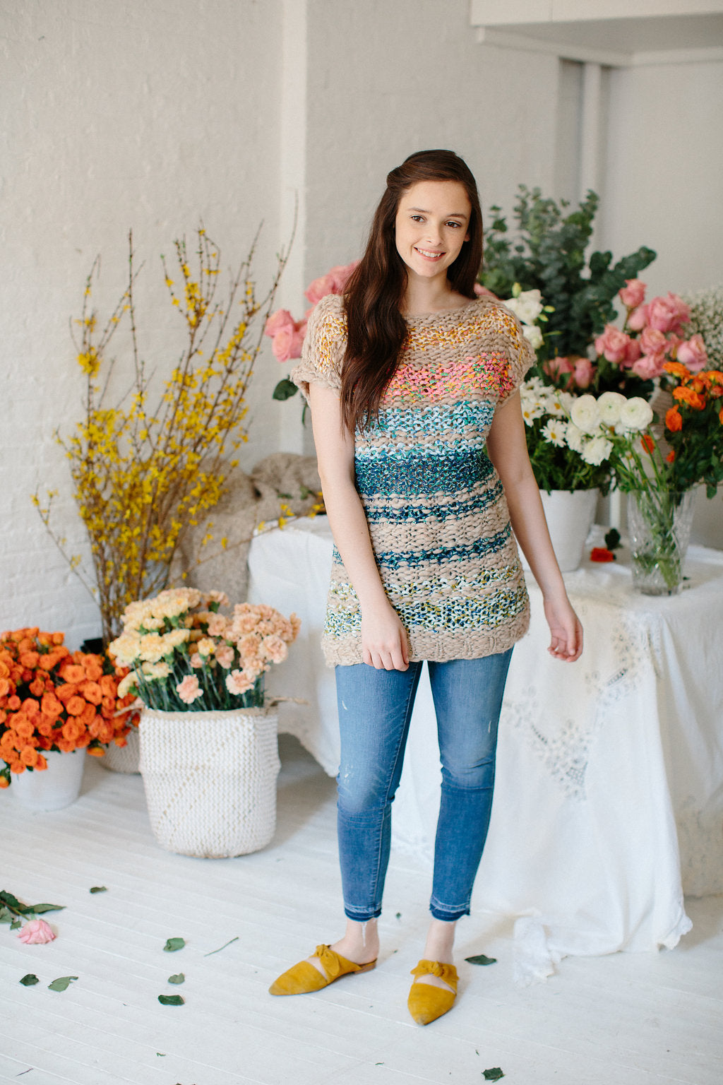 The Summer Sweetness Tunic is light and airy to wear, making it ideal for warmer weather months. This is a great design to pick if you want to explore knitting with many colorful yarns together. The pattern calls for 2 skeins of our Spun Cloud yarn and 5 skeins of our Wildflower yarn.