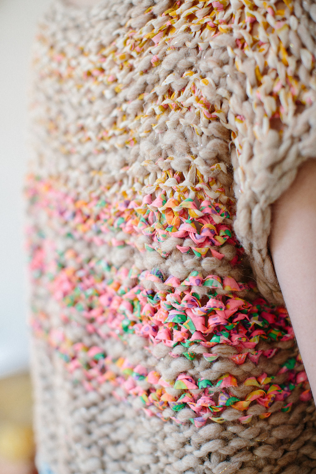 Recommended fit: 8-12” / 20-30.5 cm positive ease measured at your full bust circumference. The modeled garment in photo at right is a size XS. We like the relaxed oversize fit here!
