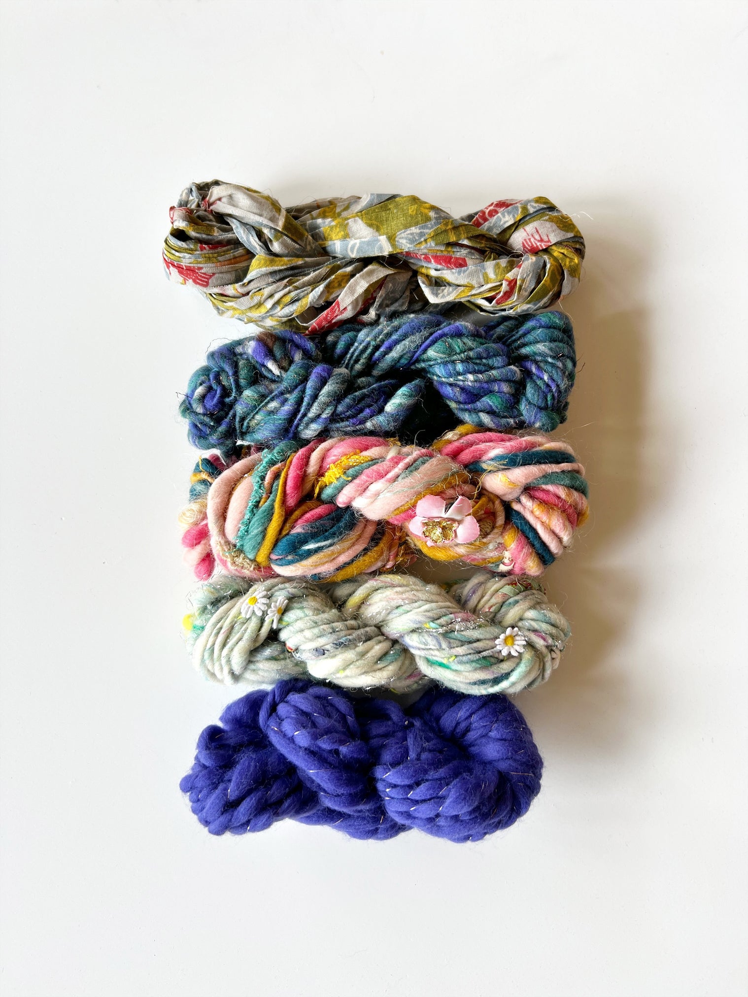 Yarn C: Daisy Chain ~ a mix of wool/mohair and sparkly fibers - content varies based on color ~ approx 17 yards