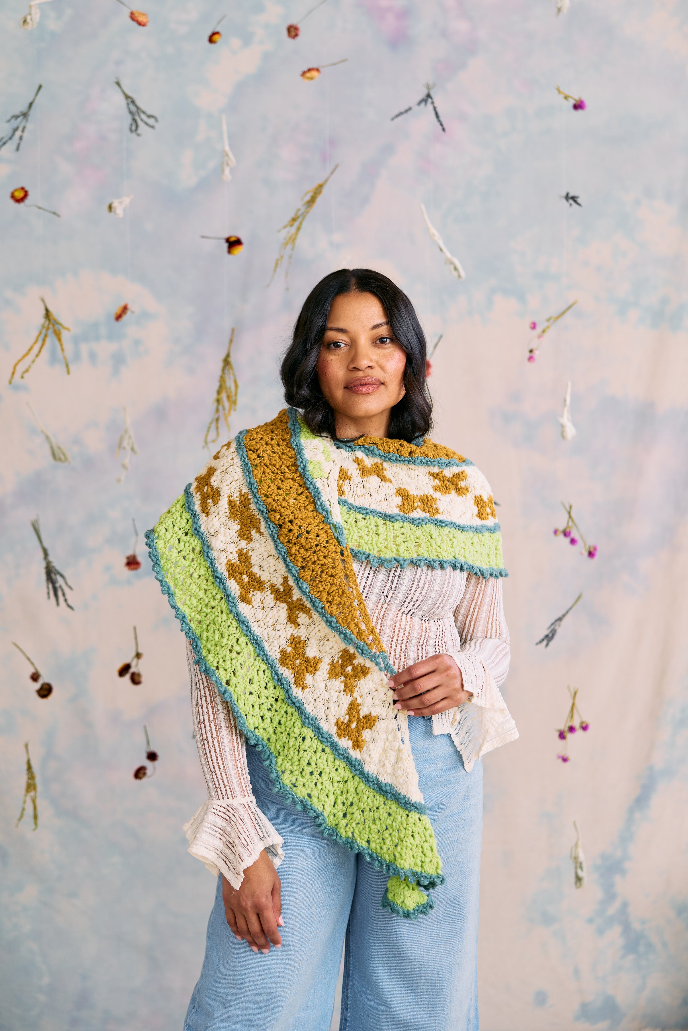Spend misty mornings wrapped in layers of color and texture with the Dew Drop Crescent Shawl. Pretty lace, bordered by contrasting garter stitch, separates panels of Fair Isle checks and flowers. A fun picot bind-off adds the finishing touch.