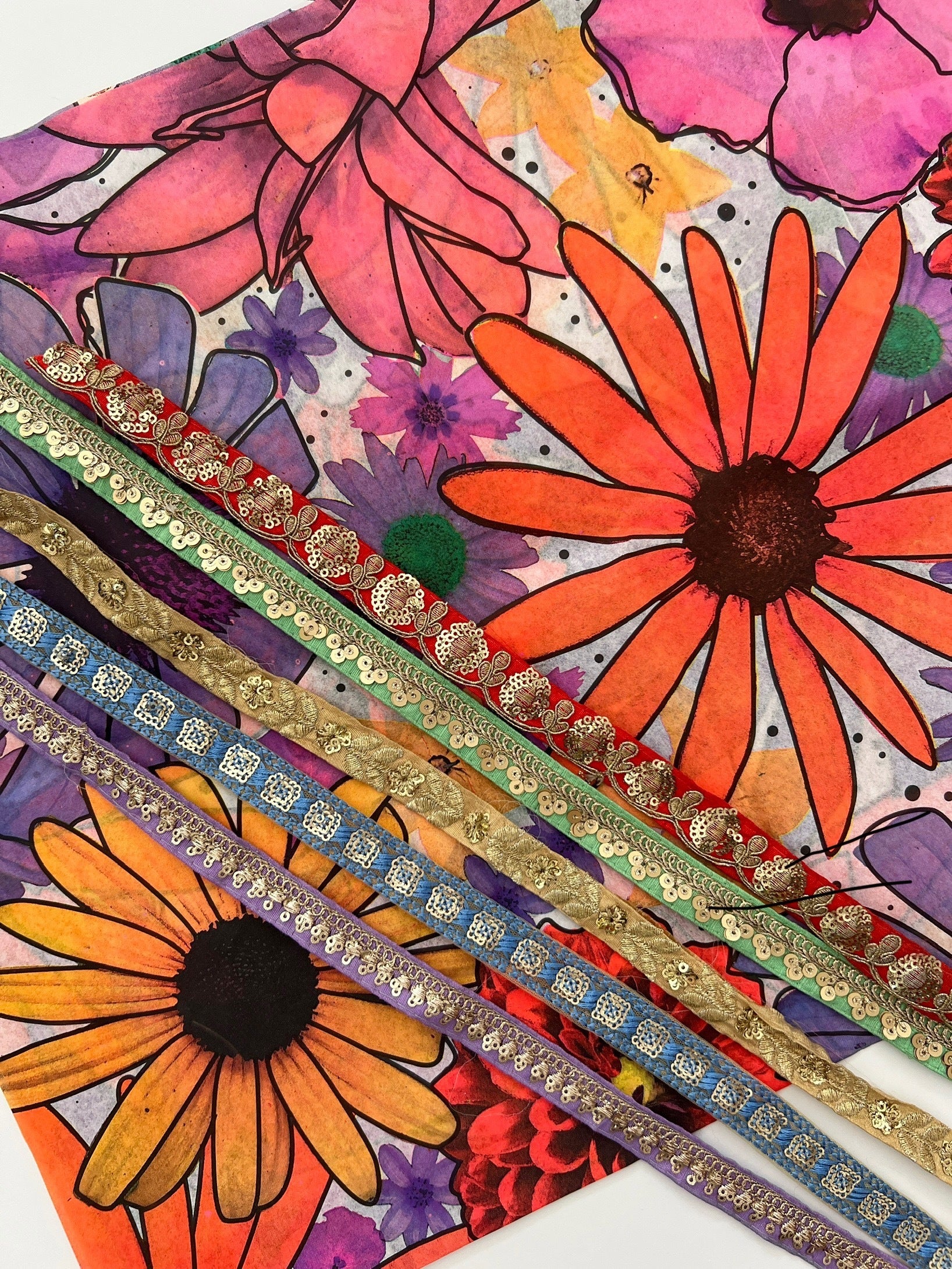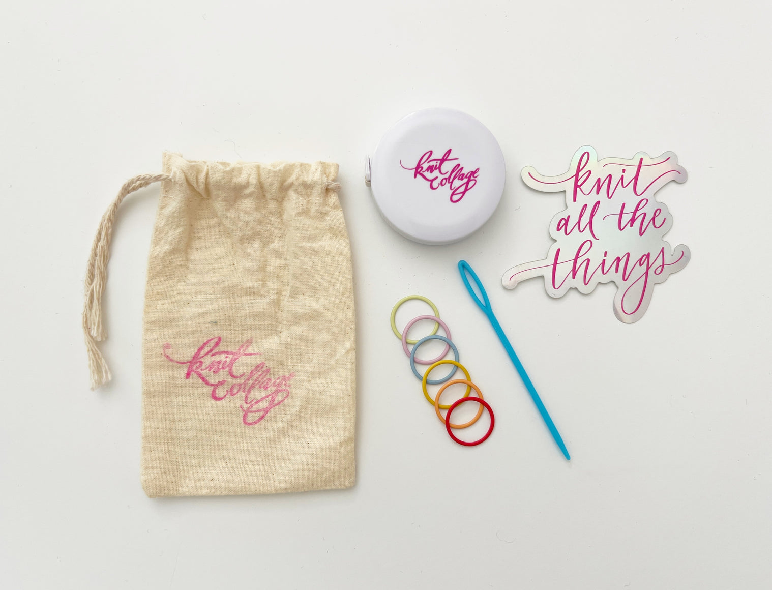 * Muslin pouch, tapestry needle, 6 Cocoknits stitch markers, a knitter's motto iridescent sticker, a tape measure and a pretty embellished ribbon from my India travels tying it all together.