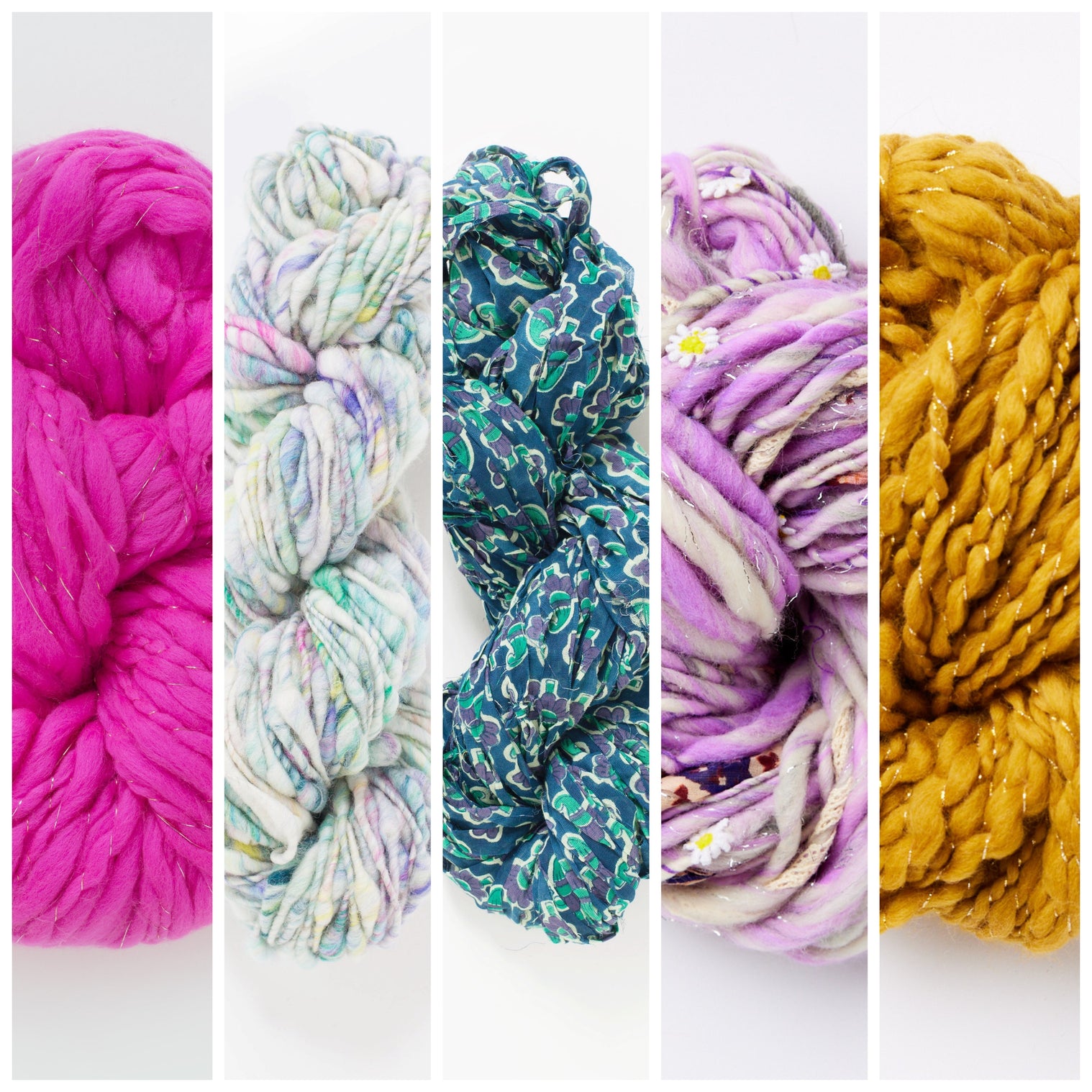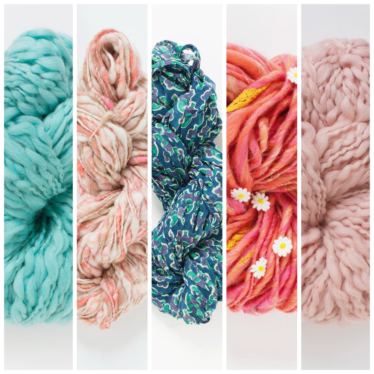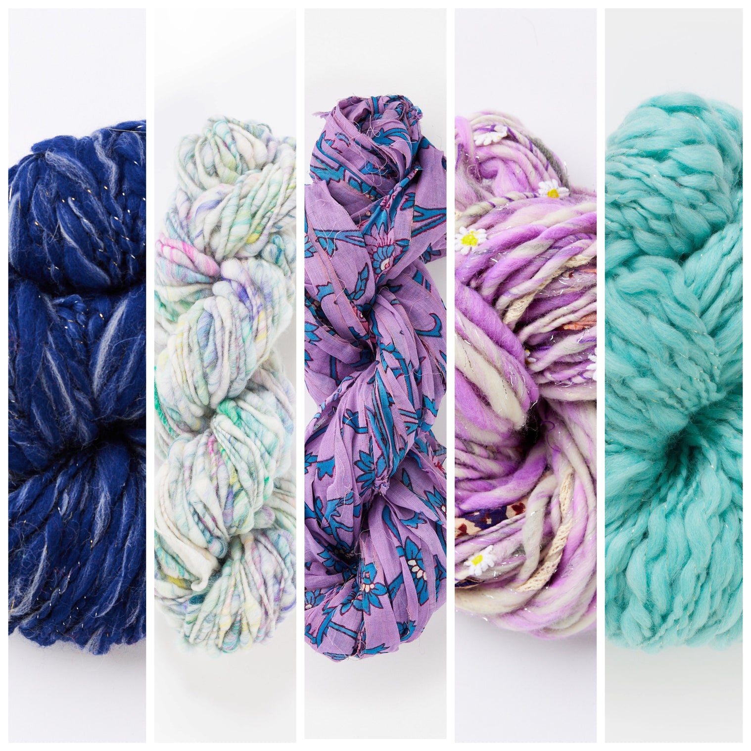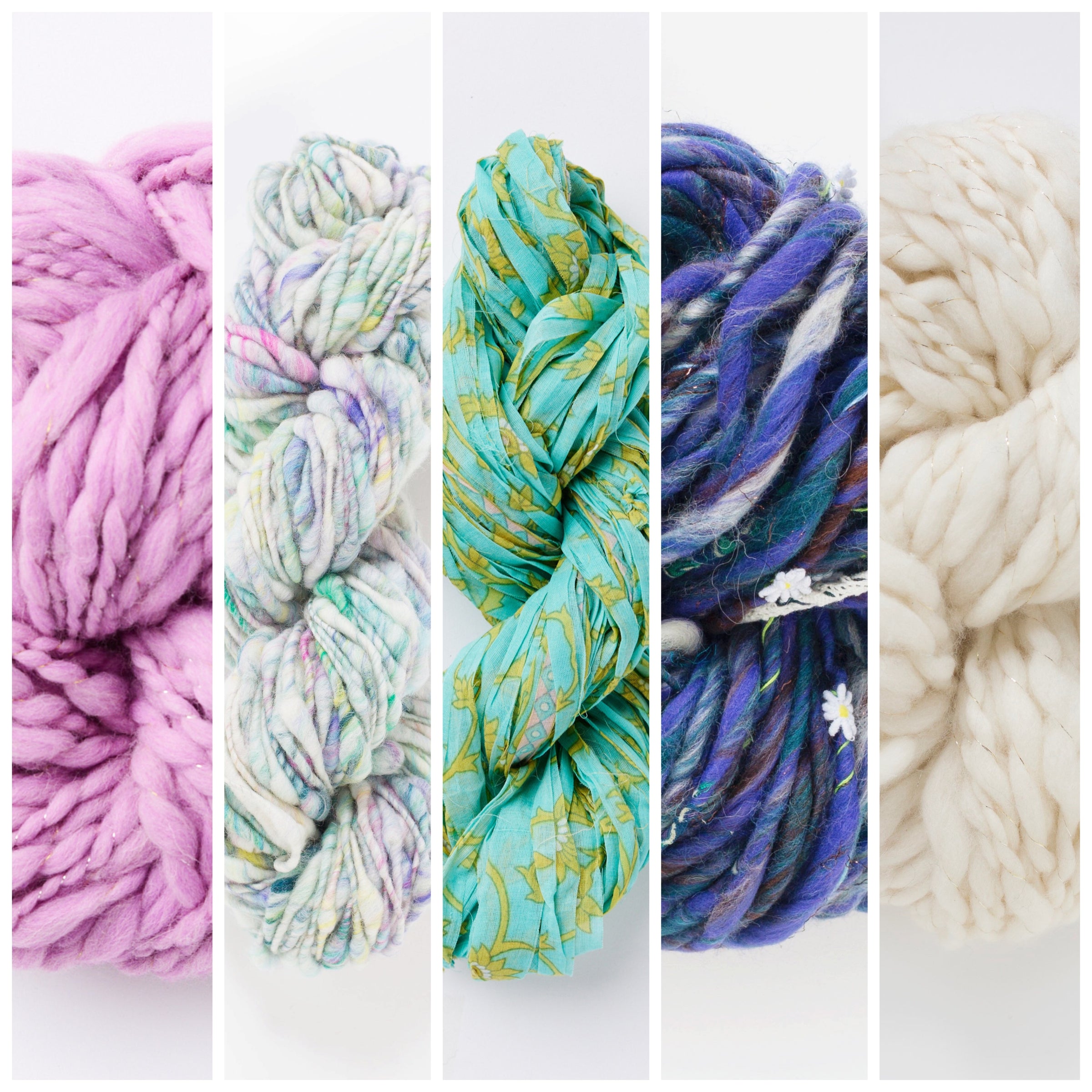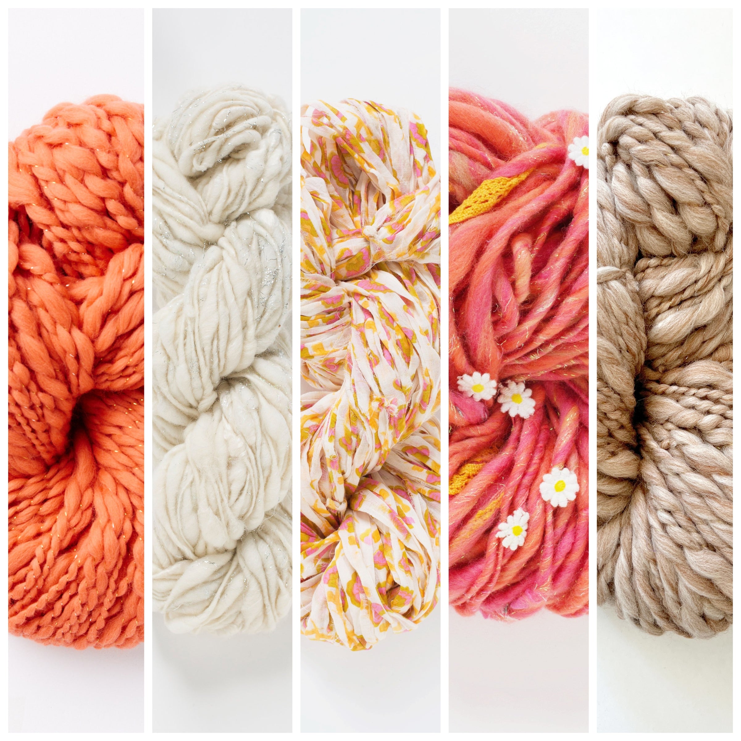 * The yarn needed to complete this project, including 4-7 skeins of 2 different Spun Cloud colors, 2- 3 skeins of Cast Away, 2-3 skeins of Wildflower and 2-3 skeins of Daisy Chain in the same color (required yarn amount varies upon size purchased).