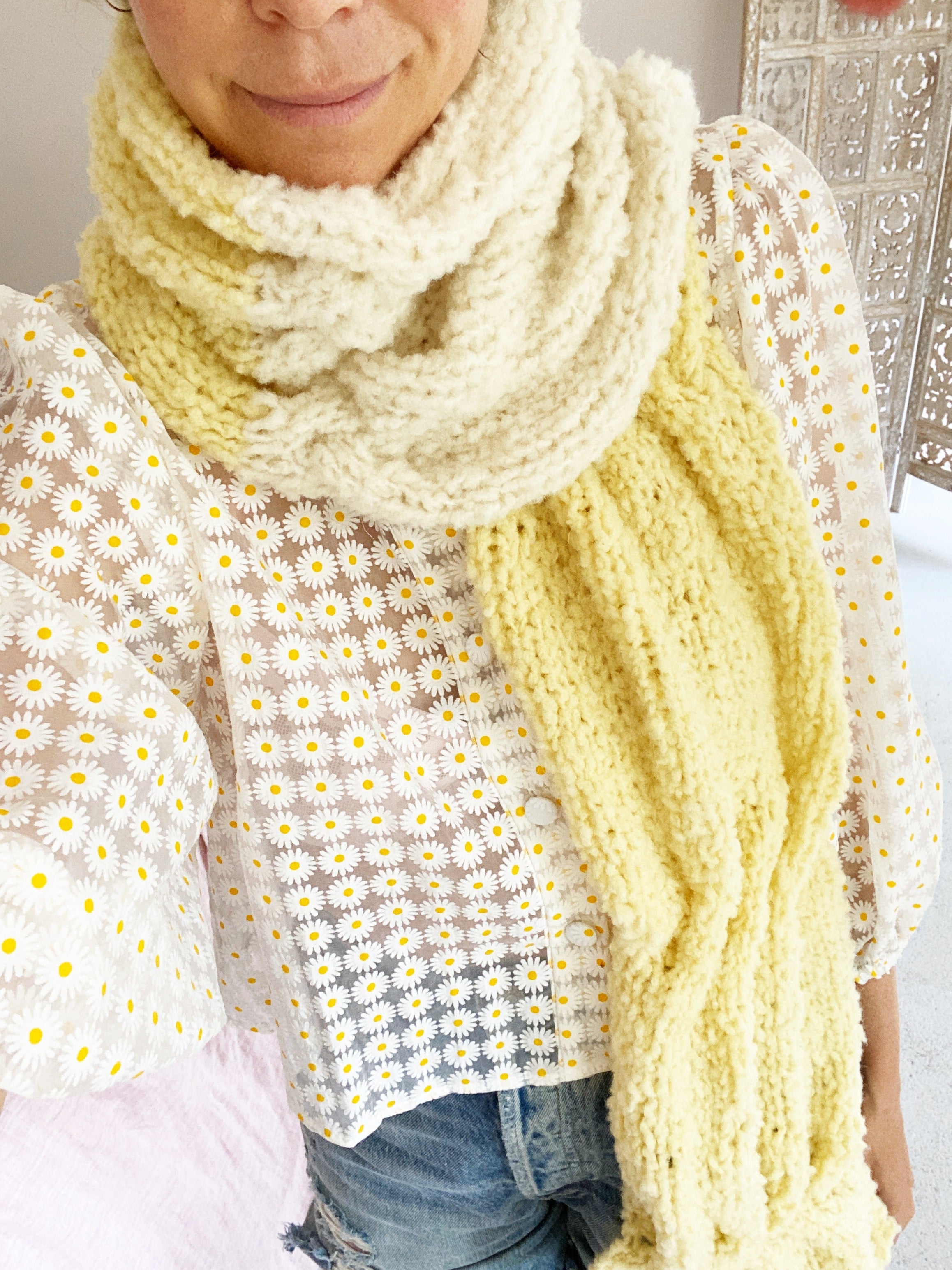 Scarf: (blocked) - approx. 11.5-12” / 29-30.5 cm wide (in between cable sections) and 70.5” / 179 cm long
