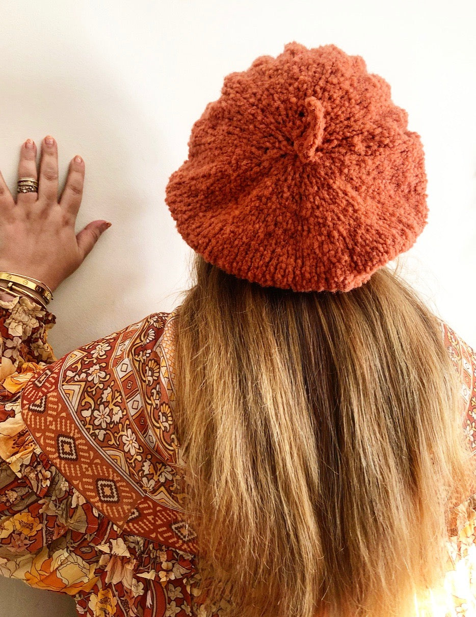 Beret: 4 sts and 5 rows = 1” / 2.5 cm in stockinette stitch on larger needles listed for beret, blocked