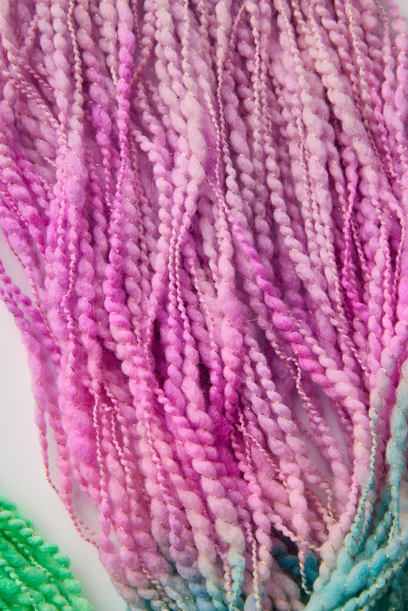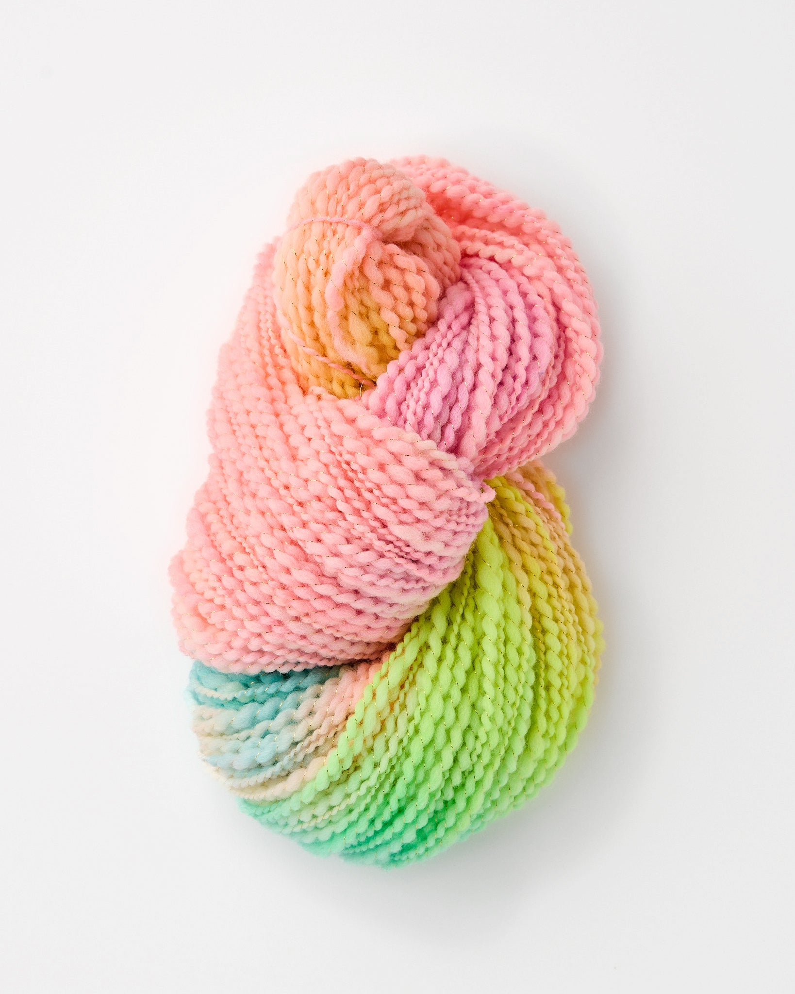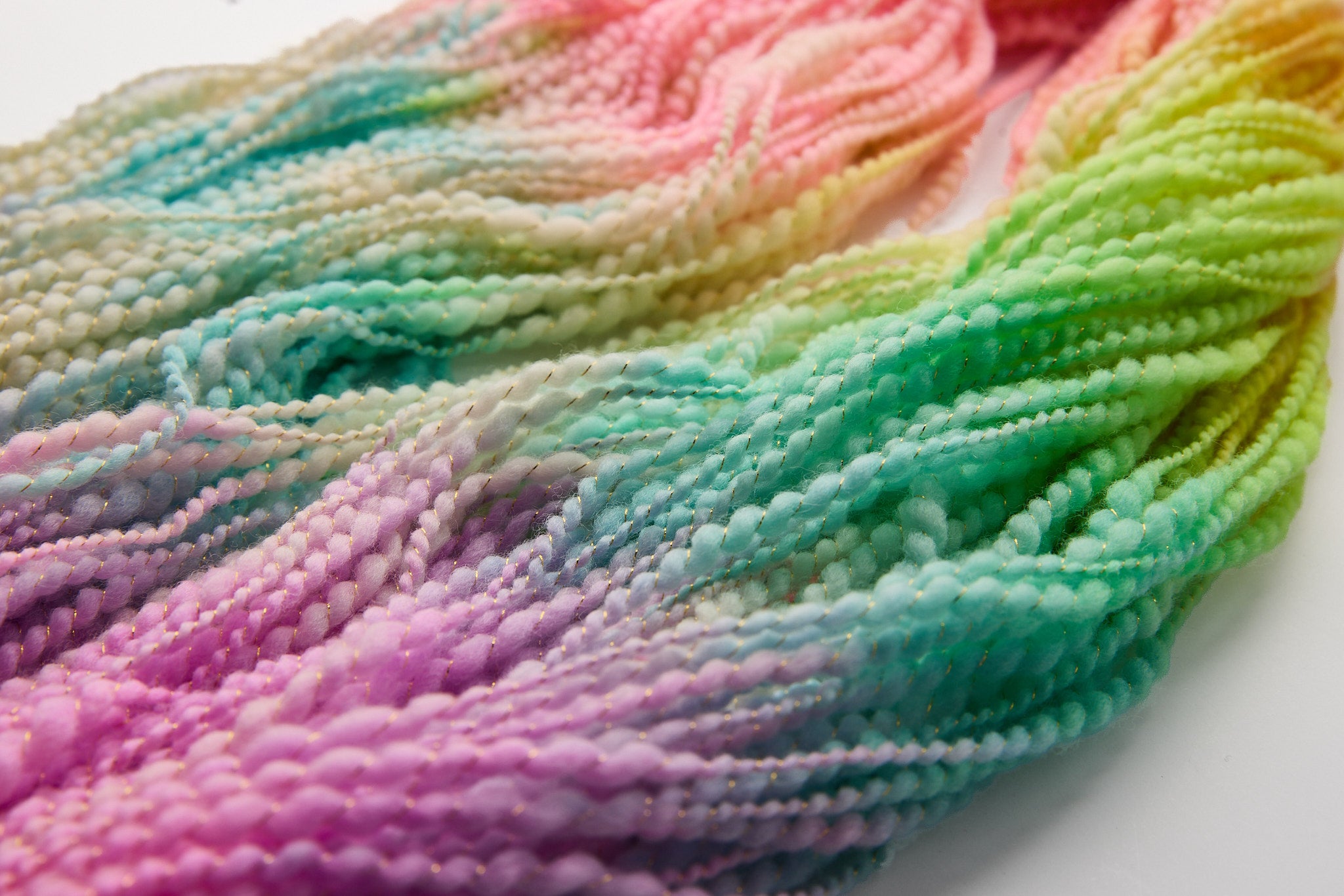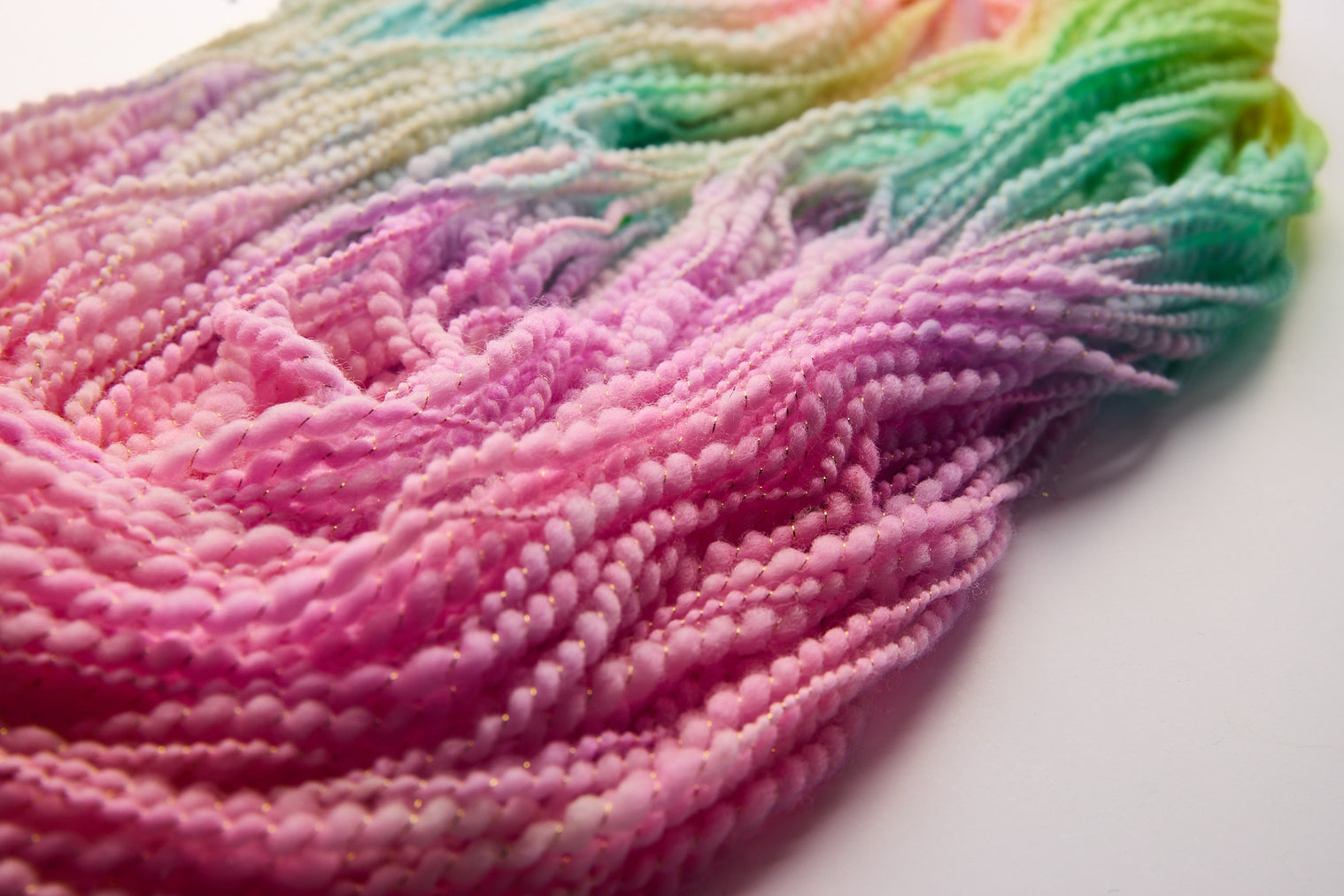 About the yarn ~ Our Spun Cloud Light yarn is fluffy, feather light and has a pretty, thick and thin texture. This yarn is 100% wool, and the Sparkle versions have 1 skinny strand of sparkly lurex plied around it. These special colorways are all indie-dyed magic on a base of Snowy! Each skein is slightly different so if you plan to knit a project that is more than one skein, consider alternating skeins to ensure each skein and colors mesh together well.