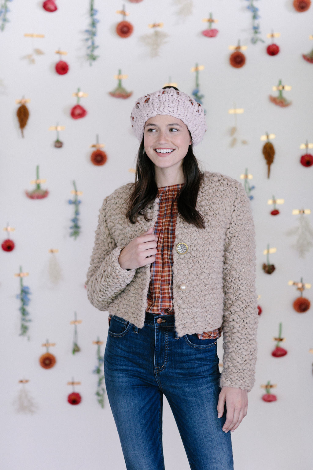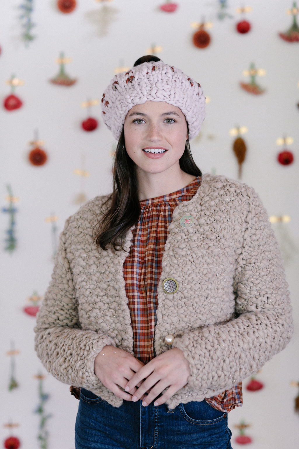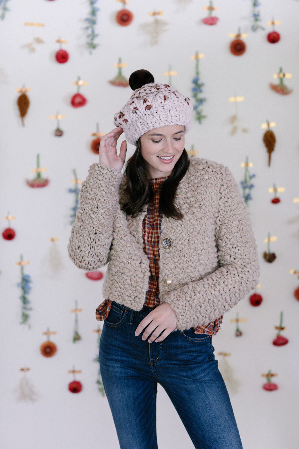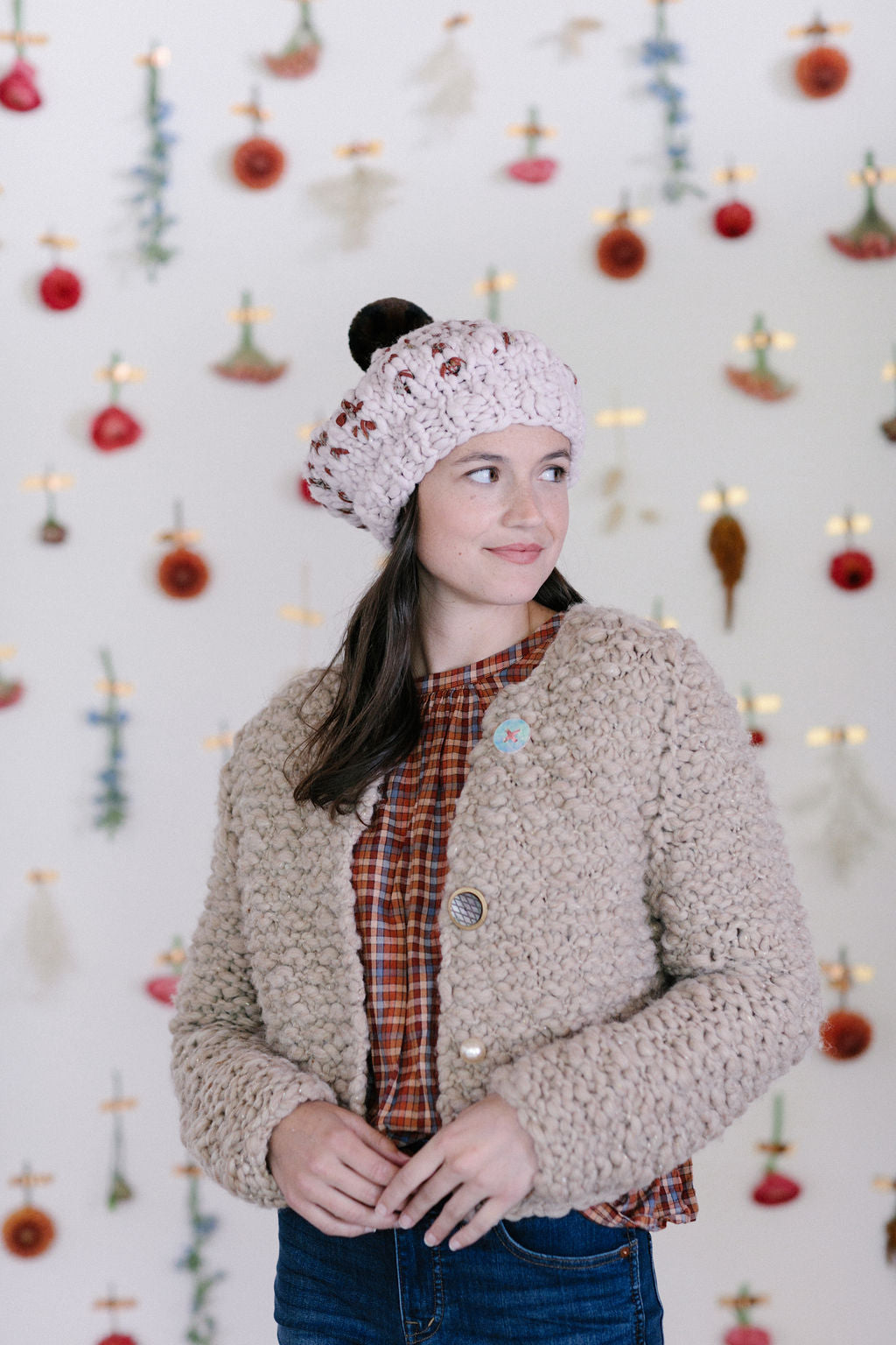 Embrace your inner Parisian with our latest hat pattern, the Pixelated Beret! I especially love the circle shape and mix of our textured yarns with the faux fur pom poms. This pattern is knit in a simple colorwork pattern where you use our Spun Cloud yarn as your main color and our Wildflower yarn as your contrast color. The sample shown here is knit in Spun Cloud color Lavender Dust and Wildflower color Sierra Redwood.