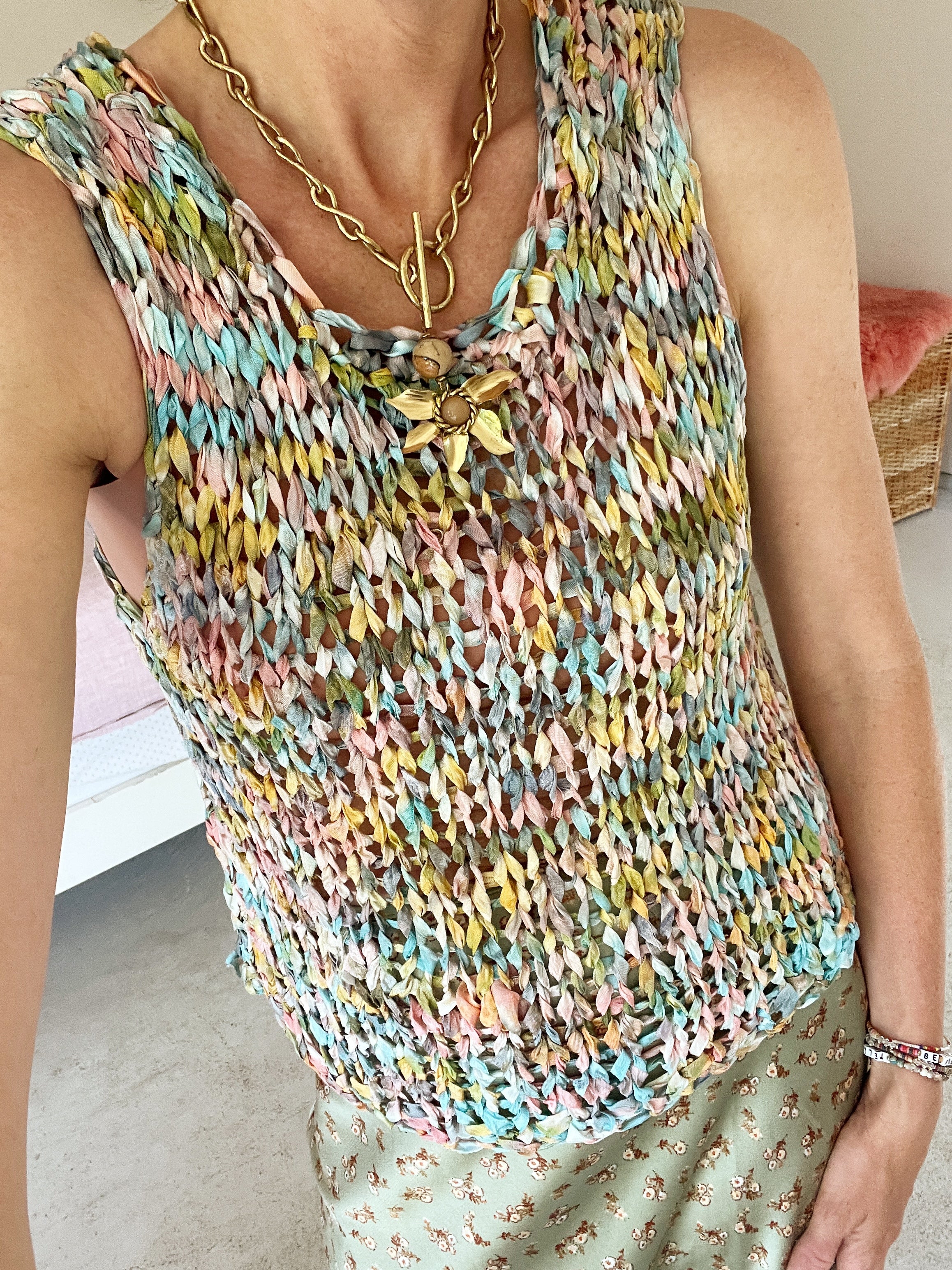 Because this is a viscose ribbon yarn, it behaves differently than a typical yarn. The fabric is very loose, stretchy and drapey. It feels bigger when worn than what the measurements suggest. Making and blocking a gauge swatch to see how the fabric behaves is highly recommended.