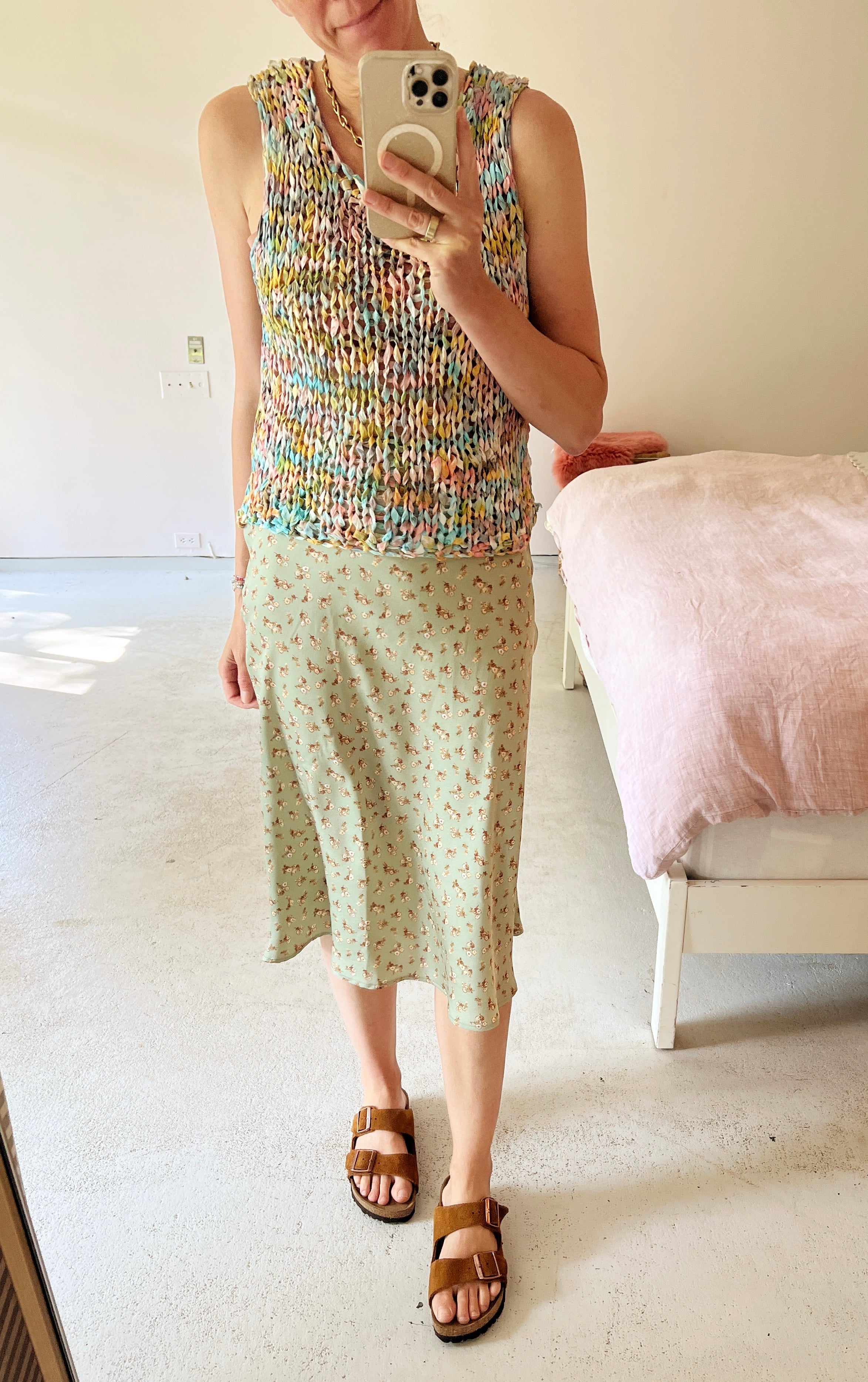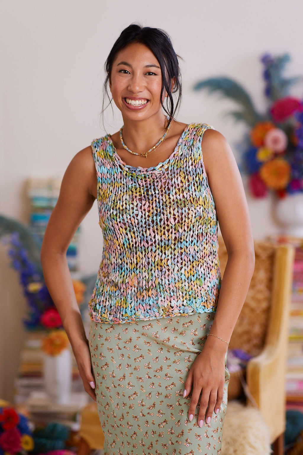Step into a watercolor painting with the Waterfall Tank. The lovely, hand-dyed, Waterfall yarn is an amazing blend of color with a light hand and drape. Combined with a loose fit, it makes the perfect tank top for summer! The wide ribbon yarn works up in no time on large needles. You’ll want one in every color!