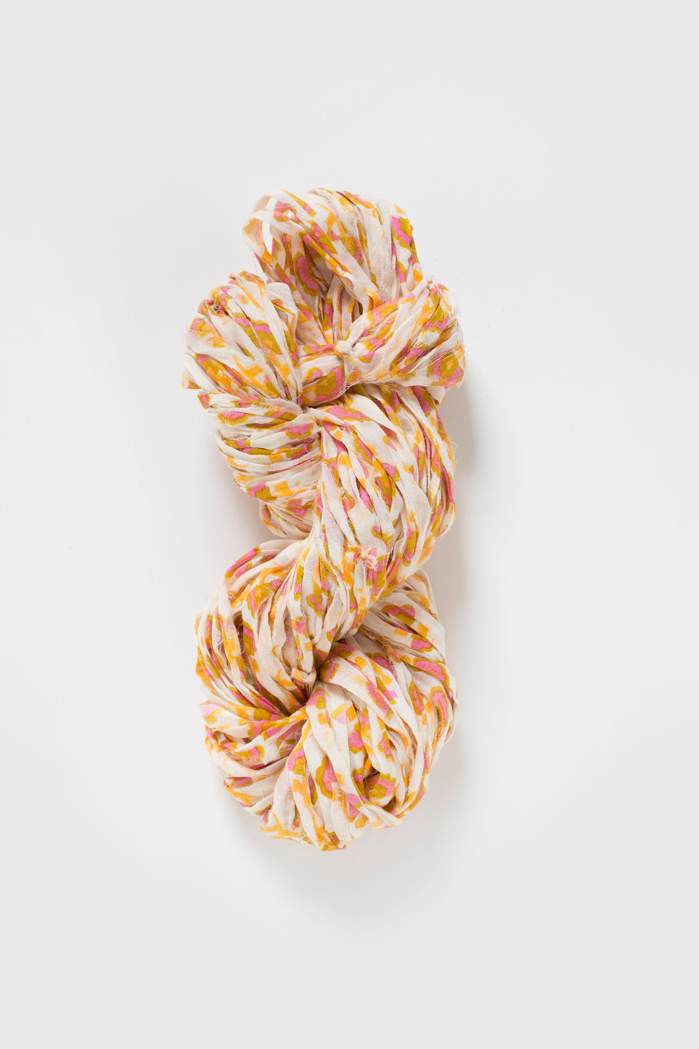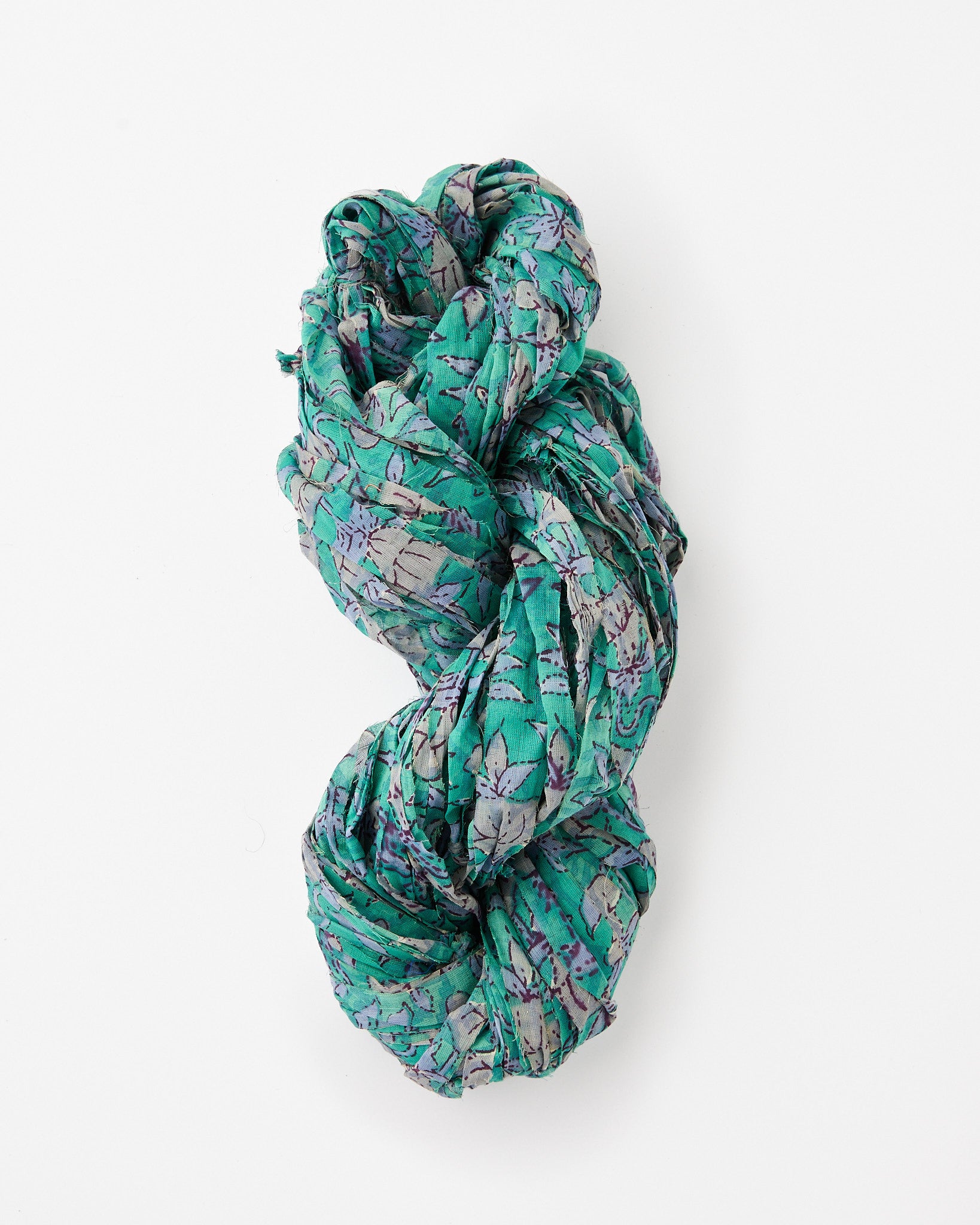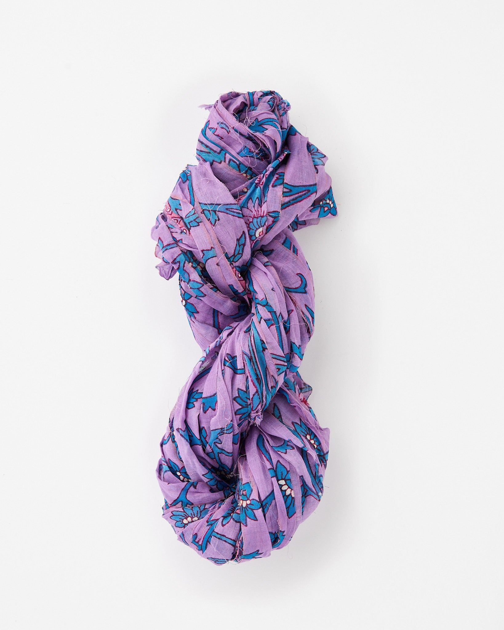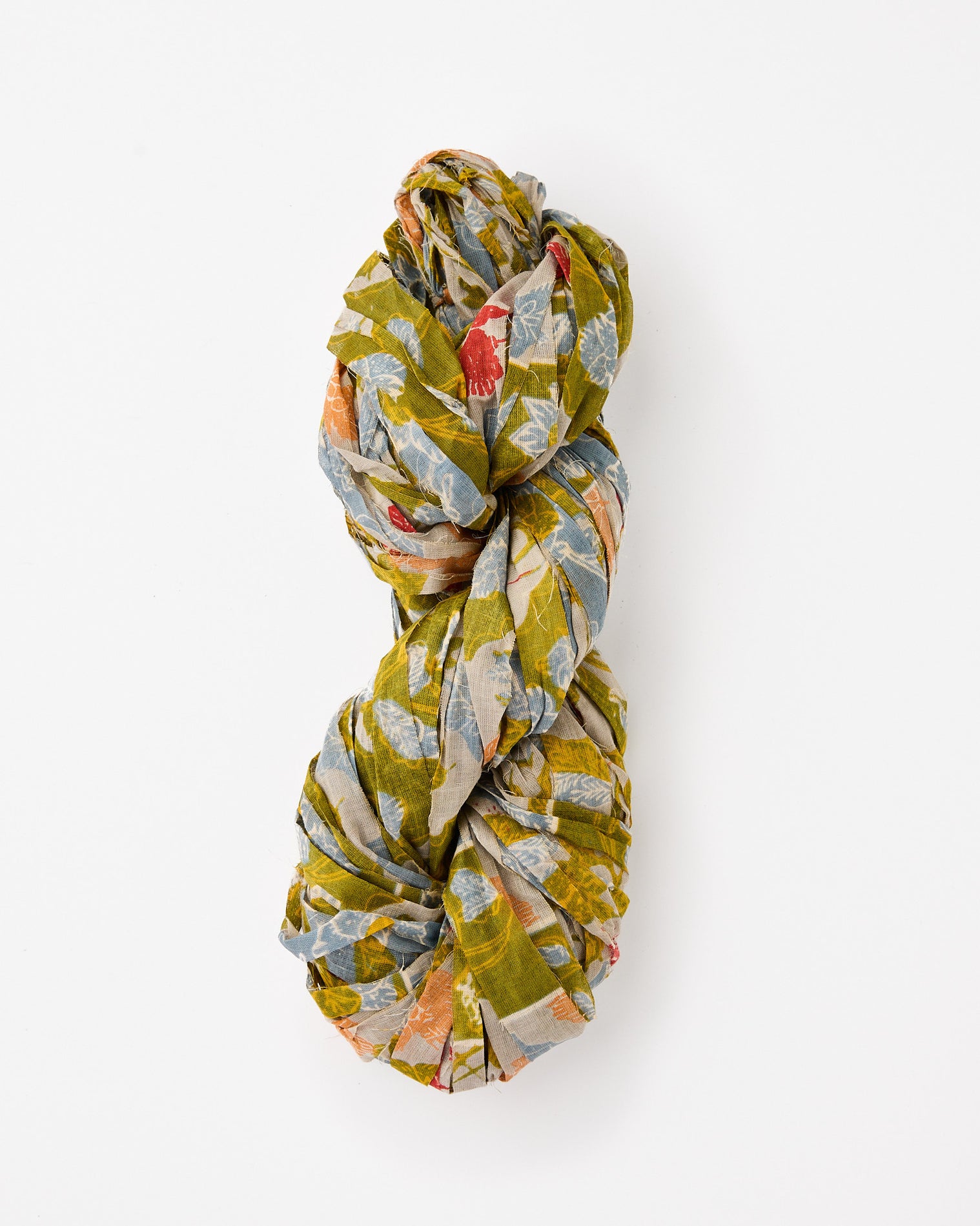 Wildflower is from cotton voile fabric that is screen printed by hand in Jaipur, India. The prints are inspired by vintage treasures both from India and the states! After the fabric is printed, it’s sent up to our team of spinners who then laser cut it into long strips. The strips are knotted together to make yarn and viola you’ve got Wildflower. Within some of the prints you’ll notice different colors and a mix of patterns - this is all part of what makes this yarn so special.